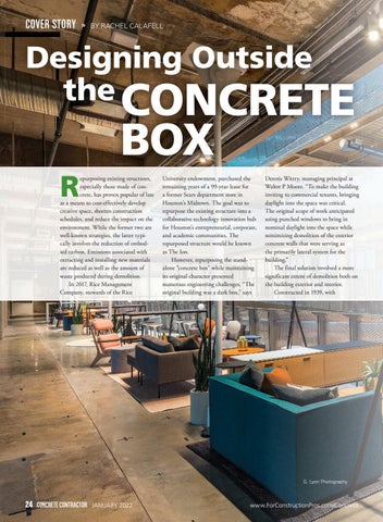 epurposing existing structures, especially those made of concrete, has proven popular of late as a means to cost-effectively develop creative space, shorten construction schedules, and reduce the impact on the environment. While the former two are well-known strategies, the latter typically involves the reduction of embodied carbon. Emissions associated with extracting and installing new materials are reduced as well as the amount of waste produced during demolition. In 2017, Rice Management Company, stewards of the Rice