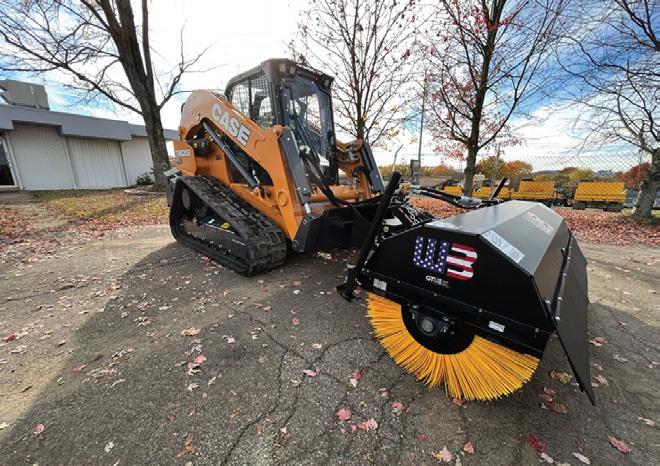 The Rhino Guardrail Pro Omni Adjustable Pile Driver The Rhino Guardrail Pro, Omni Adjustable Pile Driver is designed to expedite the installation of steel or wood posts and guardrails ranging from 2-in. round and up to 7 x 8 in. in size. Powerful hydraulics lift the hammer vertically to accommodate posts up to 8.5 ft. (2.6 meters) tall and align the hammer up to 10 degrees along the x and y axis to plumb posts accurately, regardless of jobsite topography. To maintain driving accuracy and efficiency, the Guardrail Pro Mast is fitted with two leveling indicators and offset controls allow the operator to maintain the sight line. The Guardrail Pro’s Adapter Plate and bottommounted guide keep the post secure and plumb while installing. A state-of-the-art hydraulic hammer, operating up to 1,000 bpm, delivers 800 ft.-lbs. (1,085 joule) of force to quickly install piles in all types of soils. The hammer’s mono-block design also reduces maintenance and extends the unit's life. Werk-Brau Skid Steer Angle Brooms The angle broom swings 30° left or right of center when cleaning and clearing snow, dirt, debris grass and more. Polypropylene brush with wire filaments support service life even in adverse conditions. Hydraulically driven brooms of 6-ft. or 7-ft. widths are powered by a single hydraulic motor capable of 10-22 gpm flow (standard), with dual hydraulic motors (20-44 gpm) or a low flow (8-16 gpm) motor available as options. A standard skid steer quick coupler and storage stand are provided for simple mounting, dismounting and storage. Broom speeds of up to 200 RPM are attainable, depending on the prime mover, making this angle broom applicable for skid steer loaders of various makes, models and sizes. The wafer style brush has 32-in. outside diameter (OD) x 10-in. inside diameter (ID). The brush core can be installed with either end to the left or right with no effect on sweeping performance, to simplify installation. Brush and core assembly can be removed from the frame without disconnecting drive motor hoses.
