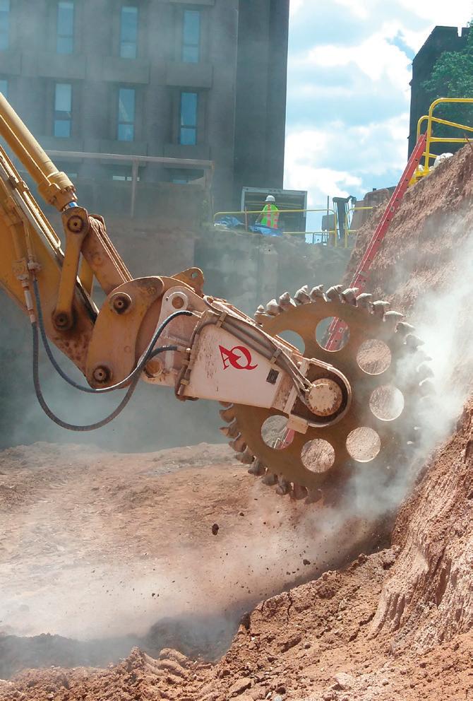 MB Crusher MB-HDS523 Shafts Screener Bucket The MB-HDS523 is compatible with excavators ranging from 30- to 45-ton operating weights and features five shafts positioned to ensure a greater production rate and processing speed. • “V Shaft System" design creates a simultaneous dual screening effect • Concealed comb allows material to enter and flow through rotors without jamming • Powered by two motors for consistent and quick performance • Shafts can be easily switched out and replaced on site in minutes • Rotors can be easily extracted and repositioned Antraquip Rockwheel Attachments Carbide and diamond saw rockwheel attachments are available for excavators of all sizes and various applications. • Carbide rockwheels offer a cutting solution for soft to medium hard rock and concrete cutting applications with a minimum width of roughly 2 in. • Diamond saw rock wheels (AQD Series) cut the hardest rock including granite, basalt, etc., as well as reinforced concrete