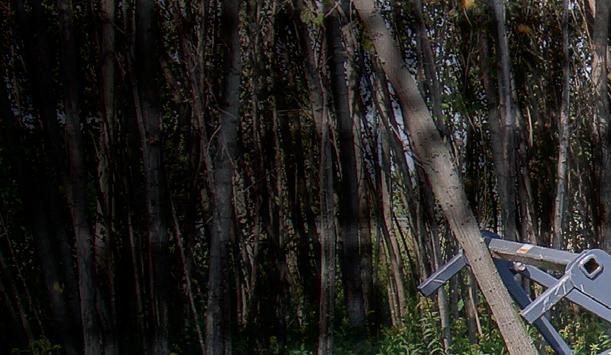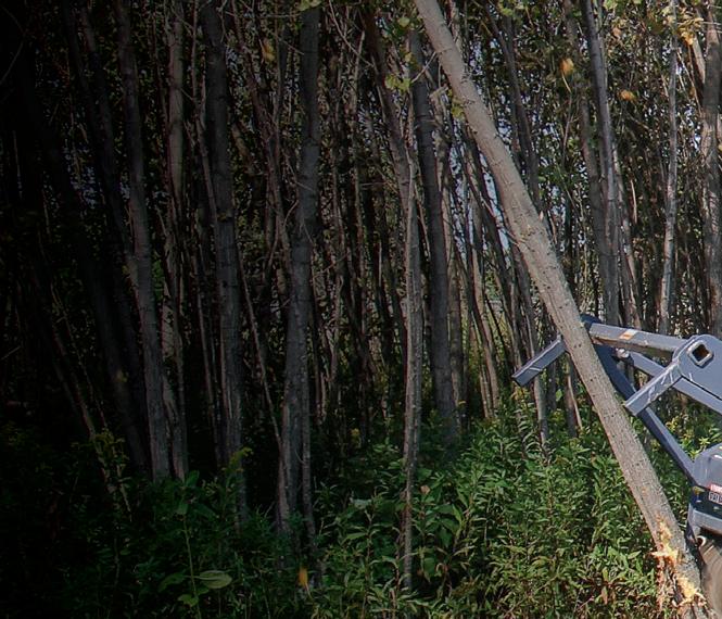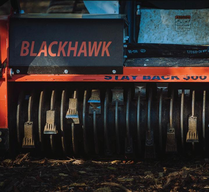 John Deere Mulcher and Brush Cutter Excavator Attachments The ME36 and ME50 Mulchers and the RE40 and RE50 Rotary Brush Cutters are equipped with knife-style cutting teeth on a split ring rotor. The spiral, double helix tool pattern and tool shape allow for efficient cutting for mulch up to 5-inch material. A controlled and metered cutting depth allows the operator to maintain high rotor revolutions per minute (rpm) and a productive mulching rate. The teeth may be sharpened and flipped for a fresh cutting edge, extending the tool's life. The mulcher attachments are designed for right-of-way maintenance and fire/fuel reduction, clearing standing or felled trees and brush along fencerows, roadsides, waterways and other hard-toreach places. The RE40 and RE50 brush cutters are designed for embankment and ditch management, over-fence brush management, rail right-of-way maintenance, and otherwise difficult to reach areas. Three swinging blades mounted to a blade carrier can fell and cut material up to 6 inches in diameter. A heavy-duty hinged debris shield retracts when the head is engaged with trees and brush, exposing the blades, and allowing for aggressive cuts. Fecon BLACKHAWK BK6218 Forestry Mulcher The BK6218 includes the features of the BLACKHAWK mulcher frame but in a narrower frame that facilitates precision mulching. • Features 24 knife tools and has a 62-in. cutting width • Cutting chamber designed to process material going forward or back dragging without leaving unprocessed material • 18-in.-diameter rotor spools up quickly and minimizes wait times • Rugged construction with 5/16-in.-thick HS steel cutting chamber with AR steel replaceable wear parts • Suited for skid steer and compact track loaders with hydraulic flows of 30 to 45 gpm