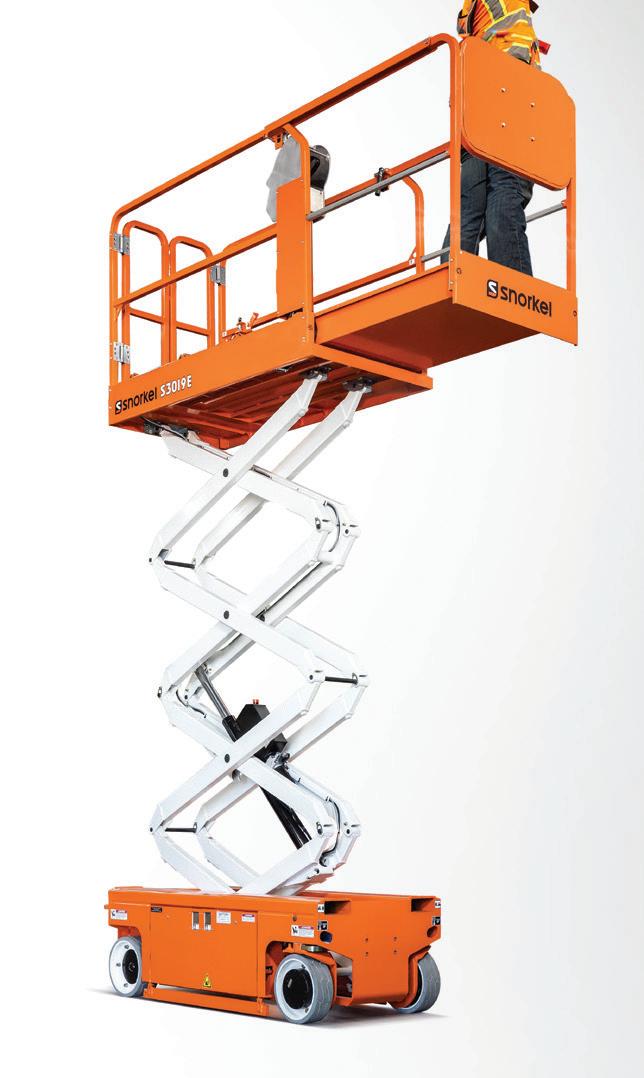 The multi award-winning Snorkel S3019E self-propelled electric scissor lift features a revolutionary sunken scissor stack that stows entirely inside the chassis for a low step-in height. A low stowed height can pass through doorways without the need for folding guardrails. This zero-emission lift stacks the deck with all-electric drive and electric steering that eliminate hydraulic hoses.