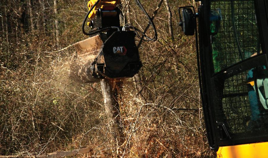 Fecon RK6015 Standard-flow Mulcher Head The RK6015 wider, standard flow mulcher head is suited for use with most skid-steer loaders and other carriers up to 75 hp that are able to provide 17 to 27 gpm of hydraulic flow. • Bite-limiting split ring rotor holds 26 knife or carbide-type cutting tools and has a 60-in. working width • Operates at 2,400 rpm and can easily shred brush and small trees up to 5 in. in diameter • Variable-displacement, 45cc hydraulic motor standard • Includes an adjustable bolt-on push bar with serrated ears for directing material • Weighs 1,490 lbs. with mounting plate and push bar Caterpillar HM3013 and HM5515 Mulchers The HM3013 and HM5515 mulchers can be used on frontreach machines from 11 to 36 tons and long-reach front machines from 40 to 52 tons. • HM3013 offers a dedicated bite limiter drum and the HM5515 has a standard drum • Variable torque hydraulic piston motor shifts between high speed, low torque and low speed, high torque to deliver speed and power when it’s needed • Hardened counter blades mounted inside housing help break down finished material • Ability to adjust hydraulic mulching door allows operator to control material throw for increased operating safety • Bolt-on replaceable skids