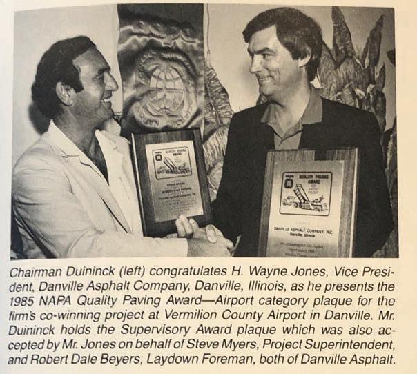 quality-minded,” Jones says. “He was active in the Illinois Asphalt Pavement Association eventually serving as their president. Later he also served in all the offices of the National Asphalt Pavement Association (NAPA), and eventually as their president. Roger always believed in giving back the industry. So much so, that he served on the steering committee that created the National Center for Asphalt Technology (NCAT) at Auburn University. Needless to say, his focus on the details to achieve success and spirit of giving back to the industry rubbed off on me.”