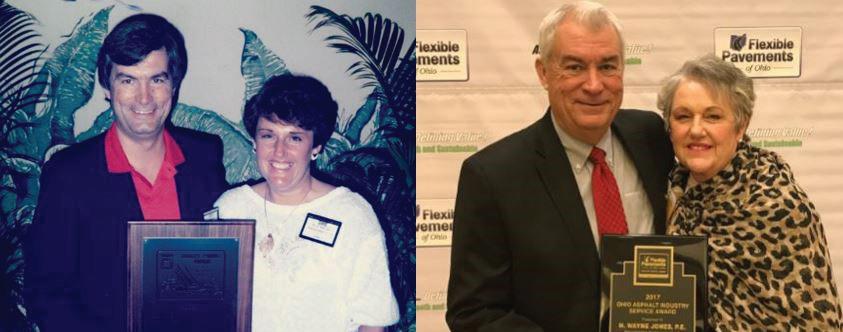 Jones went on to explain how he learned the importance of attending national conferences and trade shows such as NPE early on in his career. Soon after attending a national conference where he learned about “bolt-on” screed extensions, his division was the successful bidder on a regional airport paving project. By extending the screed to 25 feet, Jones’ crew was able to pave the 150 foot wide runway in only 6 passes rather than the 12 passes normally required. After the project was complete, Jones submitted the project for consideration for a NAPA Quality Paving Award (photo to the right). When the judges visited the project to give it a quality score, the longitudinal joints that he eliminated were given a perfect score of 100%. When the winners were announced at the end of the year, Jones got to attend the NAPA annual meeting in Honolulu to pick up the 1985 Best Quality Airport Paving Award.