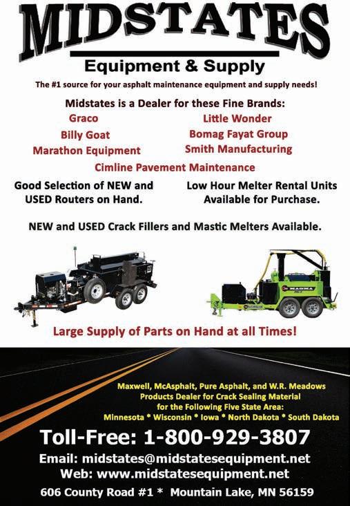 Subscription policy: Individual subscriptions are available without charge in the U.S. only to pavement maintenance contractors, producers and government employees involved in paving or pavement maintenance; dealers, and distributors of pavement maintenance equipment or materials; and others with similar business activities. Complete the subscription form at www.forconstructionpros. com or use your company letterhead giving all the information requested. Publisher reserves the right to reject nonqualified subscribers. One year subscriptions for nonqualified individuals: $35.00 U.S.A., $60.00 Canada and Mexico, and $85.00 all other countries (payable in U.S. funds, drawn on U.S. bank). Single copies available (prepaid only) $10.00 each (U.S., Canada & Mexico), $15.00 each (International). Pavement Maintenance & Reconstruction (ISSN 1098-5875), is published eight times per year: January, February, March/April, May, June/ July, August/September, October/November, December by AC Business Media, 201 N. Main St. Ste 350, Fort Atkinson, WI 53538. Periodicals postage paid at Fort Atkinson, WI and additional entry offices.