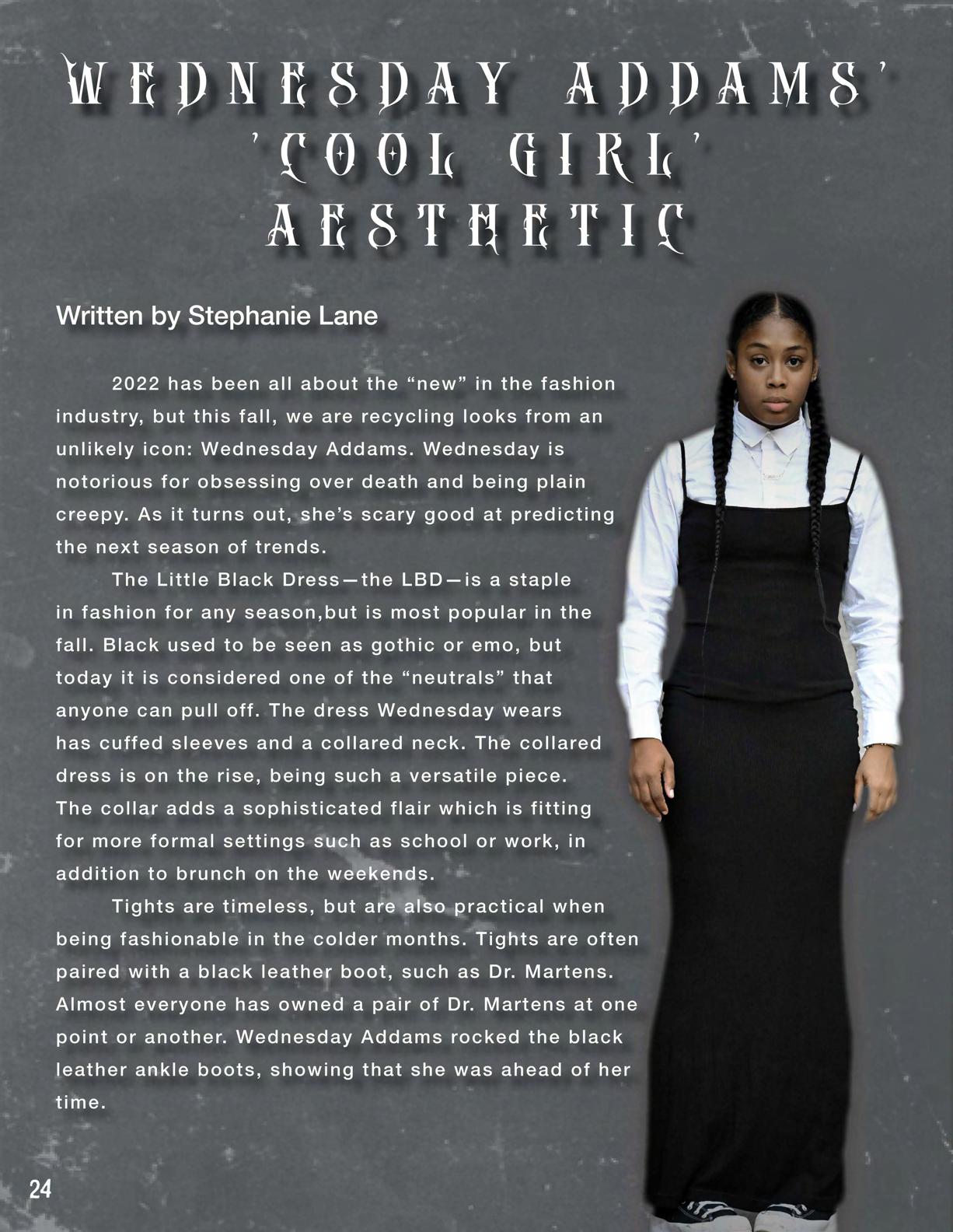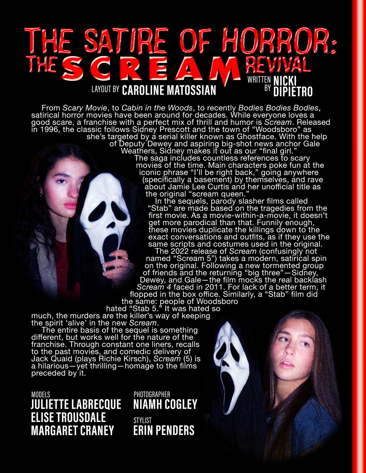 5 Blog Spotlight 5 6 A Nightmare on Gay Street 6 8 OSTON 8 10 Ti West’s Pearl: How Much Is a Woman Worth? 10 11 The Hurricane of a Generation in Bodies, Bodies, Bodies 11 12 The Satire of Horror: The Scream Revival 12 14 Ding Dong the Witch Is Back 14 15 Jennifer’s Body: Femininity in Queerness and Horror 15 16 Chanel Oberlin and Our Desire to Be On Top 16 18 Day Camp: The Death of Minimalism 18 20 Daphne Blake: Style Icon 20 21 Finding Acceptance in Camp 21 22 Immortality in Fashion! 22 24 Wednesday Addams’ “Cool Girl” Aesthetic 24 26 Is 80s Jazzercise Fashion Really Gone? 26 28 Eyeliner Is the Best New Accessory 28 29 Beetlejuice and the Rejection of Modernity 29 30 The Horrific Truth About Camp 30 32 We’re Bringing Back 80s Beauty 32 34 I Am All These Things Despite 34 36 I Blame Tim Burton (But I Also Don’t) 36 38 Tunnel Vision Consumer Habits: Why We Feel the Need to Buy 38 Everything and How to Not Buy Everything 40 The Blood-Sucking Bisexuals of American Horror Story 40 41 Boo! You’ve Been Ghosted! 41 42 Freshman Dorms Behind Closed Doors 42 43 Werewolves Are Essential 43 44 A Nightmare in Neverland 44 CUT TO: 45 EXT. MODE: Camp Horror Film 45 BACK TO 50 The Pretty Little Liars Effect 50 52 Lila Drew 52 53 Ethel Cain’s America 53 54 Sadie Sink(s) Her Teeth Into Hollywood 54 55 Forever Young: Black Mirror’s San Junipero 55 56 Hauntingly Beautiful World of Tim Burton 56 57 The Rebirth of Venus: Paris Is Burning 57 58 Please Don’t Kill Me Mr. Ghostface! 58 FADE OUT. THE END. LAYOUT BY PRUTHA CHAVAN