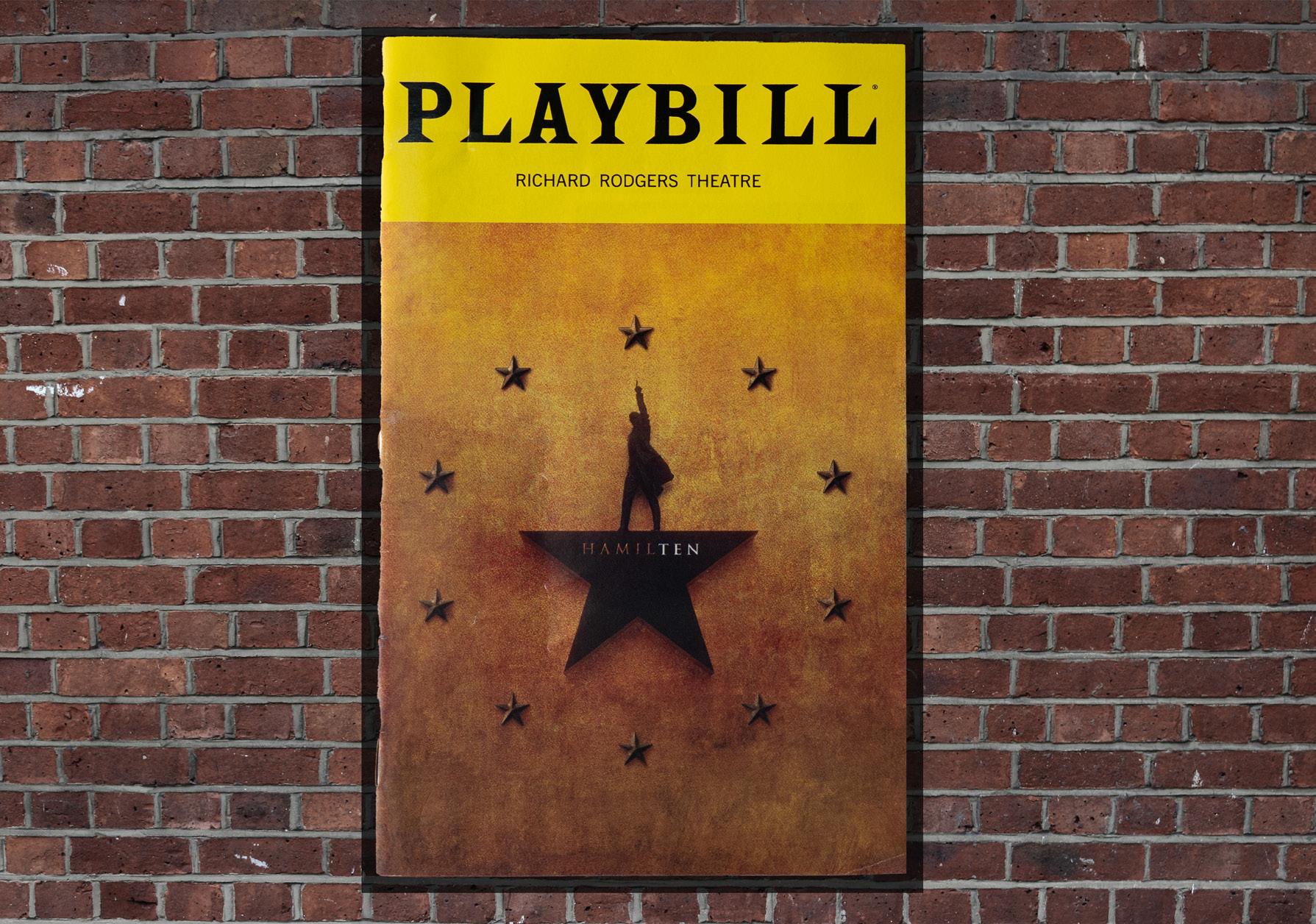 The “Hamilton” Playbill cover was also updated for the occasion, preserving the iconic silhouette of Alexander Hamilton striking a powerful pose atop a star, but now complete with an additional 10 stars symbolic of the show’s 10 years on stage circling around him.