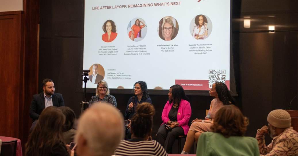 The event featured four panelists, two of whom were GSB graduates: Maryam Banikarim; Denise Bennett, GSB ’08; Sara Demenkoff, GSB ’06; and Suezette Yasmin Robotham. The panelists, currently employed, stressed how crucial resilience and adaptability were to navigating the “pivots” of their variable career paths.
