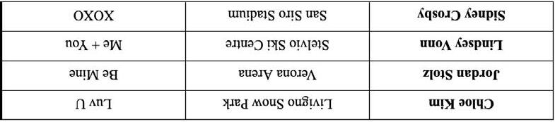 Use the clues below to match up each Olympian with their correct location and Valentine’s message. The first clue has been put in for you as an example — use “X” to cross out what’s incorrect and “✔” to denote the correct matches. Remember, no two Olympians are located in the same place or will receive the same message. After you have completed the puzzle, you can check your answers with the grid in the bottom corner!