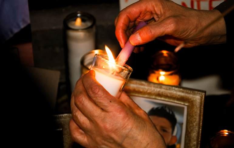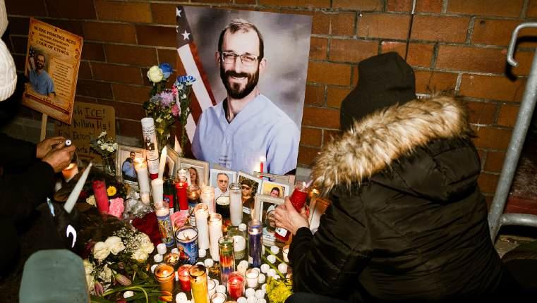 The organizers passed out hand warmers, whistles, glow sticks and candles for the hour-long evening vigil. A makeshift memorial was set up in front of the hospital with photos of ICE victims, flowers and hundreds of candles.