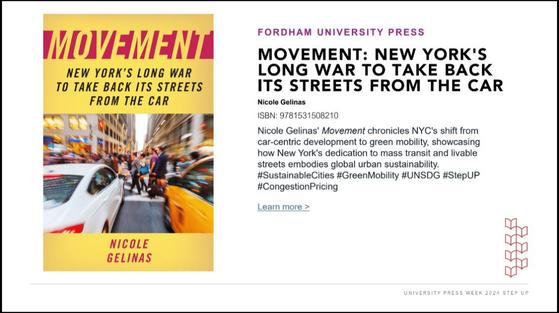 Movement: New York's Long War to Take Back Its Streets from the Car by Nicole Gelinas (page 2) couldn't be timelier. Besides offering a gripping account of how the automobile has failed NYC and how mass transit and a revitalized streetscape are vital to its post-pandemic recovery, it ends with NYC's recent implementation of (and now in jeopardy) congestion pricing The book is a finalist for the prestigious 2025 Gotham Book Prize.