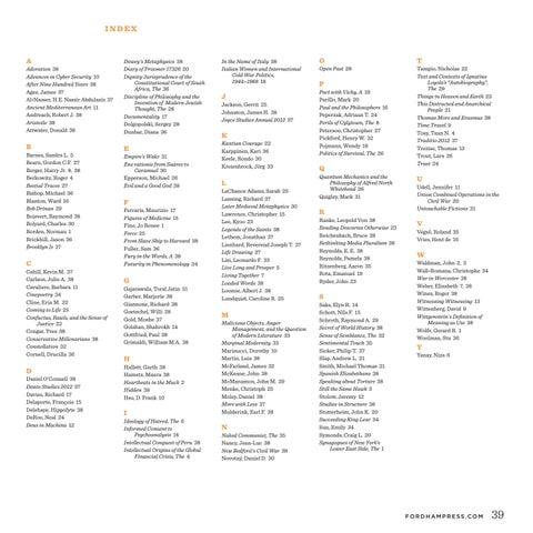 Cahill, Kevin M. 37 Carlson, Julie A. 38 Cavaliere, Barbara 11 Cinepoetry 34 Cline, Erin M. 22 Coming to Life 25 Confucius, Rawls, and the Sense of Justice 22 Congar, Yves 38 Conservative Millenarians 38 Constellation 32 Cornell, Drucilla 36