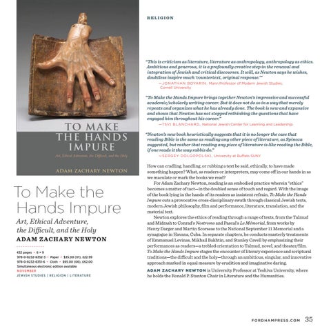 “To Make the Hands Impure brings together Newton’s impressive and successful academic/scholarly writing career. But it does not do so in a way that merely repeats and organizes what he has already done. The book is new and expansive and shows that Newton has not stopped rethinking the questions that have engaged him throughout his career.” —tsvi b la n Cha rD, national Jewish Center for learning and leadership