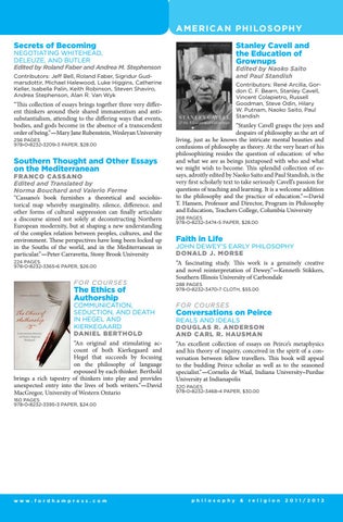 â&#x20AC;&#x153;Stanley Cavell grasps the joys and despairs of philosophy as the art of living, just as he knows the intricate mental beauties and confusions of philosophy as theory. At the very heart of his philosophizing resides the question of education: of who and what we are as beings juxtaposed with who and what we might wish to become. This splendid collection of essays, adroitly edited by Naoko Saito and Paul Standish, is the very first scholarly text to take seriously Cavellâ&#x20AC;&#x2122;s passion for questions of teaching and learning. It is a welcome addition to the philosophy and the practice of education.â&#x20AC;?â&#x20AC;&#x201D;David T. Hansen, Professor and Director, Program in Philosophy and Education, Teachers College, Columbia University 268 PAGES 978-0-8232-3474-5 PAPER, $28.00
