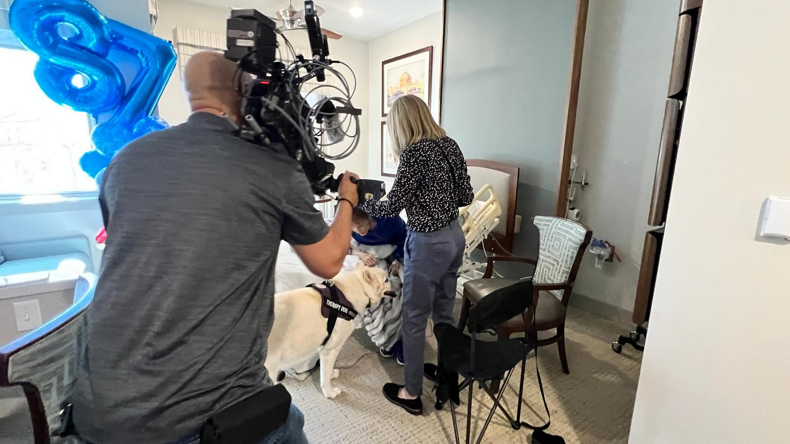 Through planning and coordination with Lisa Kanarek and the teams at Faith Presbyterian Hospice (FPH) and Forefront Living, within two days of receiving the request, FPH was able to accommodate a CBS film crew inside the T. Boone Pickens Hospice Center (TBPHC). The videographer and audio tech spent several hours filming Lisa and her dog, Gaia, visiting patients in the TBPHC as part of the special feature. Read more.