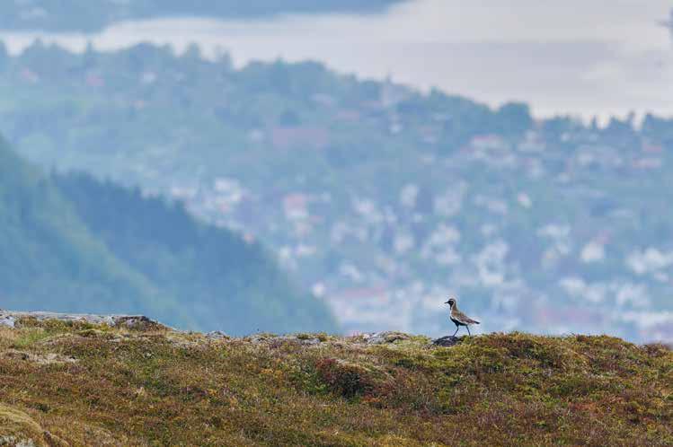 i hekkeperioden. Dei finn mat i dei små vatna på Vidden. Min favoritt er likevel heilo. Det er ein høgfjellsfugl som hekkar på Hardangervidda og andre høgfjells område, men om sommar en finst den også fåtalig på Vidden. For ein lyd han lagar, såre fine fløytelydar! For ei gåve å ha slike skapningar rett utanfor sentrum.