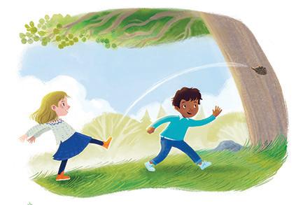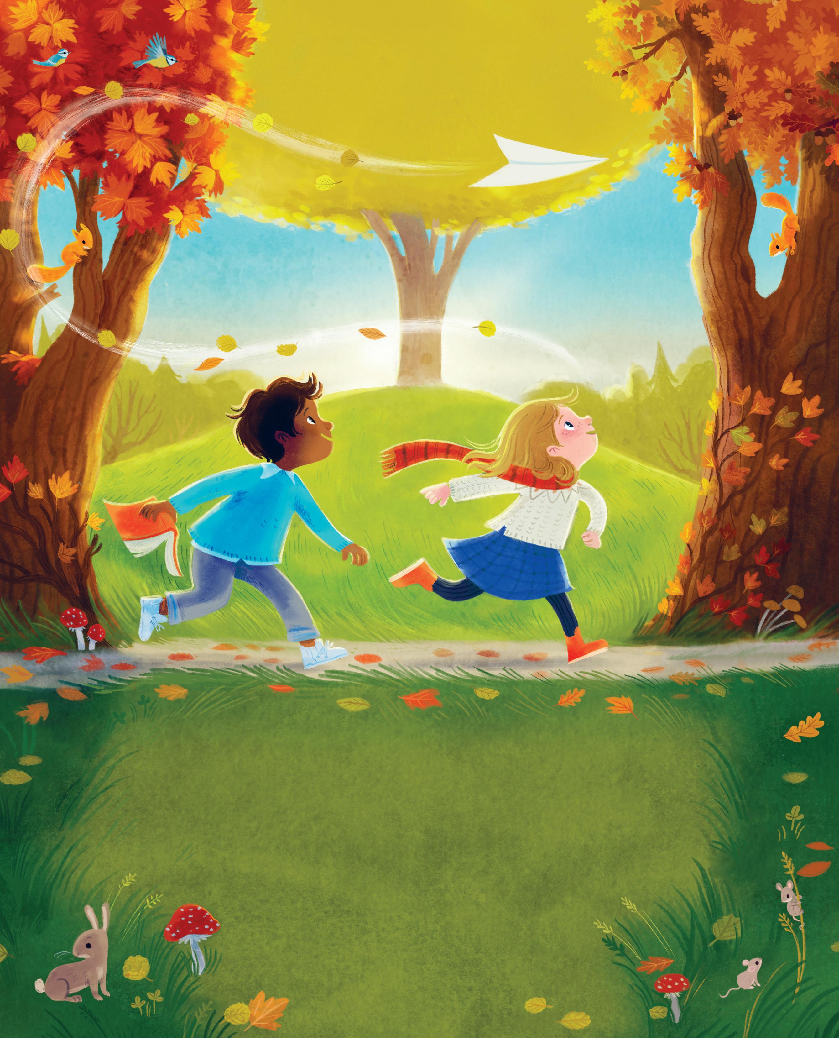 Se, her kommer flyet! Først flyr det helt rett, så virvler det rundt før det lander med ett i boka til gutten, som IKKE blir blid. Han reiser seg fort opp fra skogsputa si.