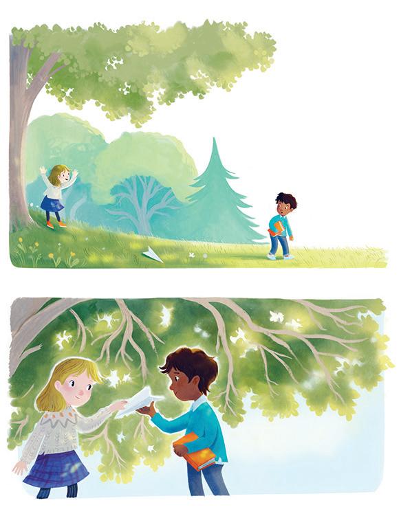 her kommer ei jente med fly av papir. Hun sender det fra seg, det flyr og det glir.