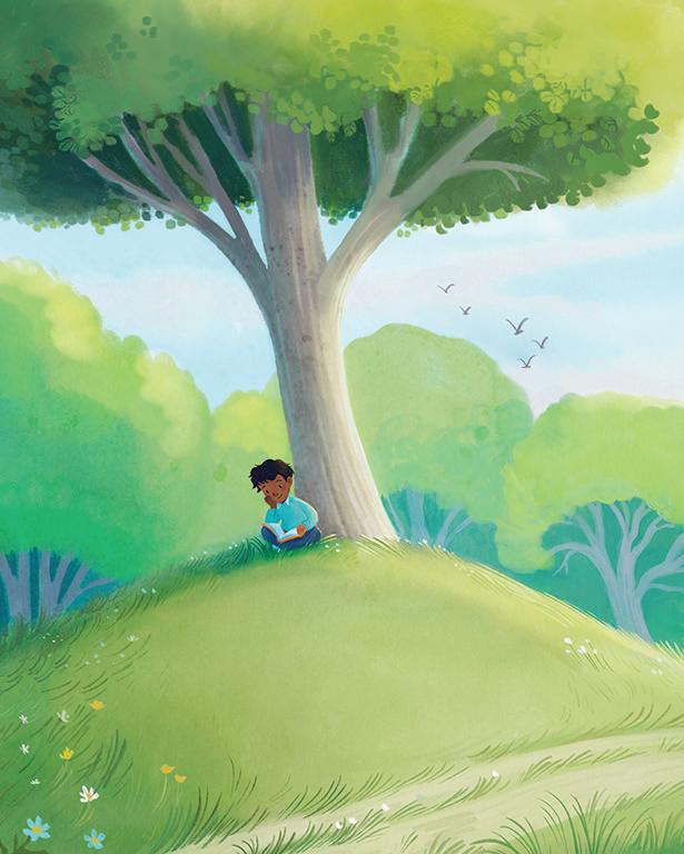 Her er en skog full av høye trær, og her er det høyeste treet der. Her er en gutt som har satt seg ned ved stammen og leser sin bok i fred.