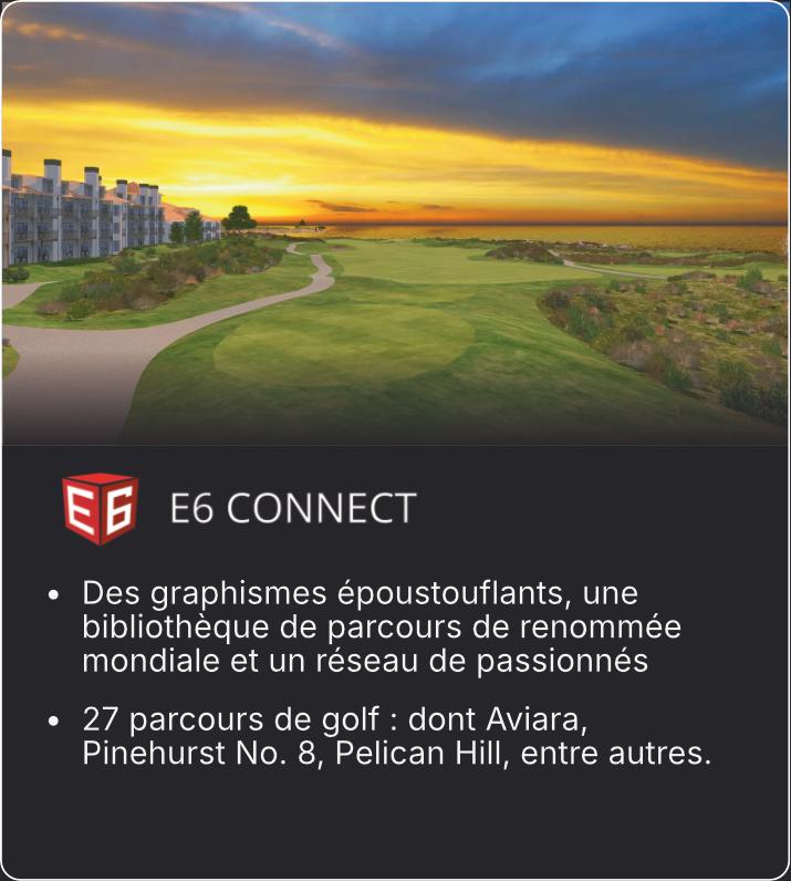 Nous proposons la plus grande bibliothèque de logiciels intégrés pour nos moniteurs de lancement. Profitez de notre incroyable sélection d'options tierces, notamment GSPro, Awesome Golf, Creative Golf 3D, E6 Connect et Swing Catalyst, pour personnaliser votre expérience de jeu selon vos préférences !
