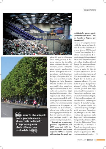 teriali risulta ancora particolarmente deficitaria? Cosa sta facendo la Regione per incentivarla? «Vi sono in Campania diverse realtà che hanno un buon livello di raccolta differenziata e vi sono almeno 300 Comuni “virtuosi” i cui standard di vivibilità e di attuazione di sistemi adeguati di raccolta dei rifiuti sono competitivi con le più evolute cittadine del nord Europa. Le province di Benevento, Avellino e Salerno superano la media del 50% di raccolta differenziata, ma la media regionale si attesta sul 30% a causa dell’asse CasertaNapoli dove il livello si abbassa notevolmente. Il punto è che in queste due province abitano 3 milioni e 800mila cittadini, più della metà degli abitanti dell’intera regione; e l’attenzione mediatica, puntata esclusivamente su Napoli, fa sì che nell’immaginario collettivo si abbia un’immagine negativa di tutta la Campania. Per questo auspico che l’amministrazione partenopea arrivi, attraverso l’attuazione del piano per la raccolta differenziata già approvato dalla Regione e il cui finanziamento è disponibile, almeno al 50% di raccolta differenziata. Trovo assurdo che, ad esempio, a Napoli non si proceda ancora alla raccolta dell’umido. Ed è proprio su questo che la differenziata risulta deficitaria». CAMPANIA 2011 • DOSSIER • 199