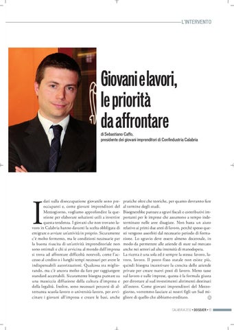 pratiche oltre che teoriche, per quanto dovranno fare al termine degli studi. Bisognerebbe puntare a sgravi fiscali e contributivi importanti per le imprese che assumono a tempo indeterminato nelle aree disagiate. Non basta un aiuto relativo ai primi due anni di lavoro, perché spesso questi vengono assorbiti dal necessario periodo di formazione. Lo sgravio deve essere almeno decennale, in modo da permettere alle aziende di stare sul mercato anche nei settori ad alta intensità di manodopera. La ricetta è una sola ed è sempre la stessa: lavoro, lavoro, lavoro. Il posto fisso statale non esiste più, quindi bisogna incentivare la crescita delle aziende private per creare nuovi posti di lavoro. Meno tasse sul lavoro e sulle imprese, questa è la formula giusta per dirottare al sud investimenti altrimenti destinati all’estero. Come giovani imprenditori del Mezzogiorno, vorremmo lasciare ai nostri figli un Sud migliore di quello che abbiamo ereditato. CALABRIA 2012 • DOSSIER • 13