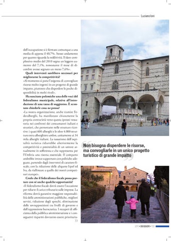 dell’occupazione si è fermato comunque a una media di appena il 40,7%. Stesso andamento per quanto riguarda la redditività. Il dato complessivo medio del 2010 segna un leggero aumento del 7,1%, nonostante il mese di dicembre avesse segnato un meno 7,6%». Quali interventi sarebbero necessari per migliorarne la competitività? «Al momento si pone l’esigenza di convogliare risorse molto ingenti in un progetto di grande impatto, piuttosto che disperdere le poche disponibilità in molti rivoli». Ha suscitato polemiche una delle voci del federalismo municipale, relativa all’introduzione di una tassa di soggiorno. È scontato chiederle cosa ne pensa? «La nostra organizzazione, anche tramite Federalberghi, ha manifestato chiaramente la propria contrarietà verso questa ipotesi vessatoria nei confronti dei consumatori italiani e stranieri, che pernottano nelle strutture ricettive: i quasi 600 alberghi e le oltre 4.000 strutture extra alberghiere umbre, unitamente ai 34 mila alberghi italiani. La tassazione dell’ospitalità turistica ridurrebbe ulteriormente la competitività e potenzialità di un settore attualmente in sofferenza e che rappresenta per l’Umbria una risorsa essenziale. Il comparto andrebbe invece supportato con politiche adeguate, partendo dagli interventi di carattere fiscale, con la riduzione delle aliquote Irpef ed Iva, da riallineare a quelle dei nostri competitori europei». Crede che il federalismo fiscale possa portare con sé anche qualche opportunità? «Il federalismo fiscale dovrà essere l’occasione per ridurre il carico tributario sulle imprese. La riforma dovrà garantire maggiore responsabilità delle amministrazioni pubbliche, migliori servizi, riduzione degli sprechi, eliminazione delle sovrapposizioni tra livelli di governo e dell’oppressione burocratica. I recuperi di efficienza della pubblica amministrazione e i conseguenti risparmi dovranno essere prioritaria-