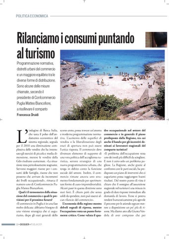 Rilanciamo i consumi puntando al turismo Programmazione normativa, distretti urbani del commercio e un maggiore equilibrio tra le diverse forme di distribuzione. Sono alcune delle misure chiamate, secondo il presidente di Confcommercio Puglia Matteo Biancofiore, a risollevare il comparto Francesca Druidi