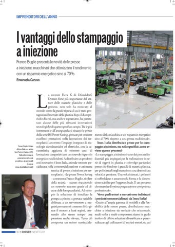 I vantaggi dello stampaggio a iniezione Franco Buglio presenta le novità delle presse a iniezione, macchinari che ottimizzano il rendimento con un risparmio energetico sino al 70% Emanuela Caruso