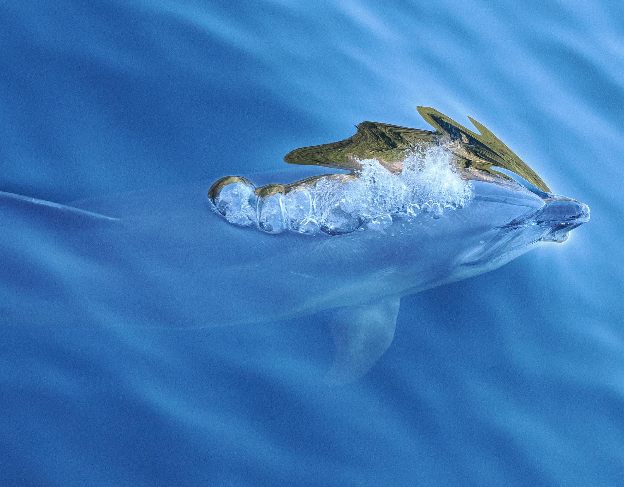 Earlier this year, I saw an advertisement for Heritage Expeditions in Forest & Bird so I booked the seven-day Southern Fiords trip in July. It was great, well worth it. I photographed this terehu bottlenose dolphin in Acheron Passage, between Breaksea Sound and Dusky Sound. We were lucky that it hadn’t rained for a while so the usual brown tannin-stained freshwater layer was absent, giving great water clarity. I particularly like this photo because it becomes more interesting the more you look at it – the bubble stream as it reaches the surface, the film of water about to break over its snout, and the reflection of the sunny hills in its wake.