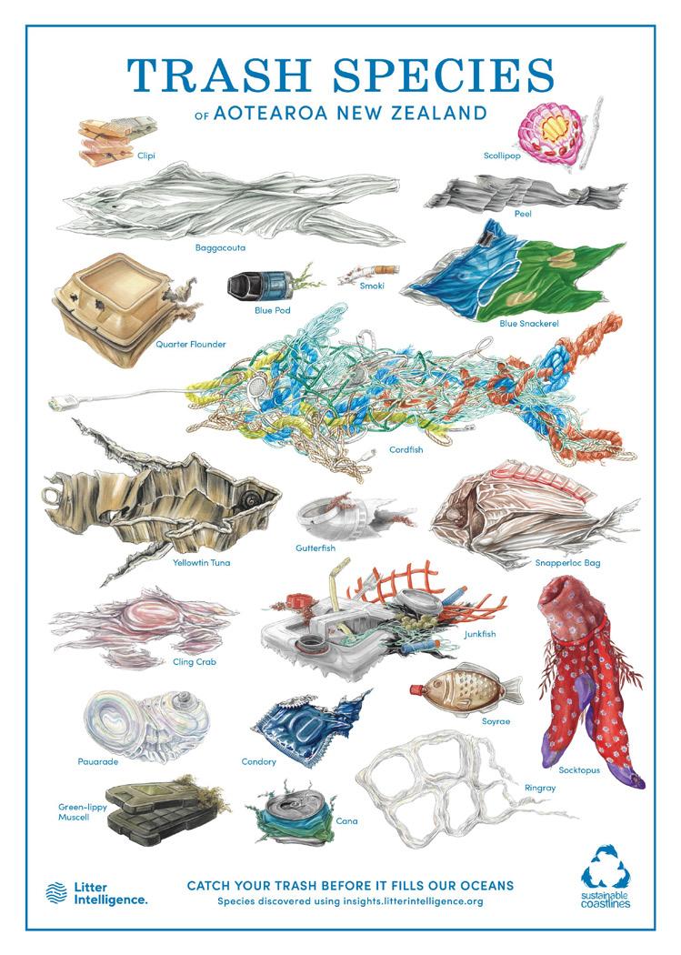 Environmental charity Sustainable Coastlines has recreated a famously fishy Kiwi poster to reveal some unwanted “new species” lurking in the ocean.