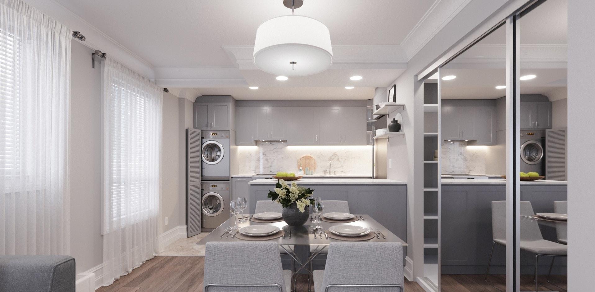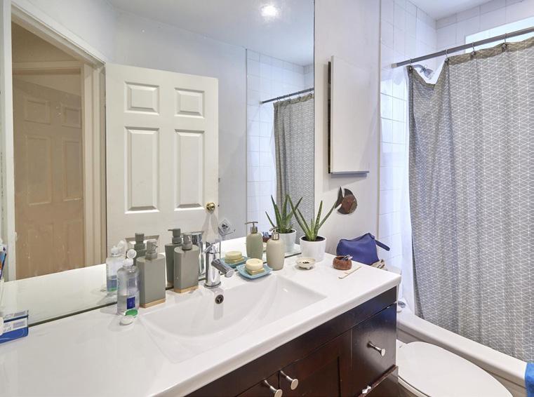 This Suite is a stunning 3-story, 1,200 sq ft space with 2 balconies, either a 3 bedrooms layout or 2 bedroom plus private loft home office. It is completely renovated, with all new hardwood flooring, stainless appliances, bathrooms and kitchens, and built in closets throughout. In-suite laundry, dishwasher, air conditioning, 1 parking spots aboveground, and a locker are included.