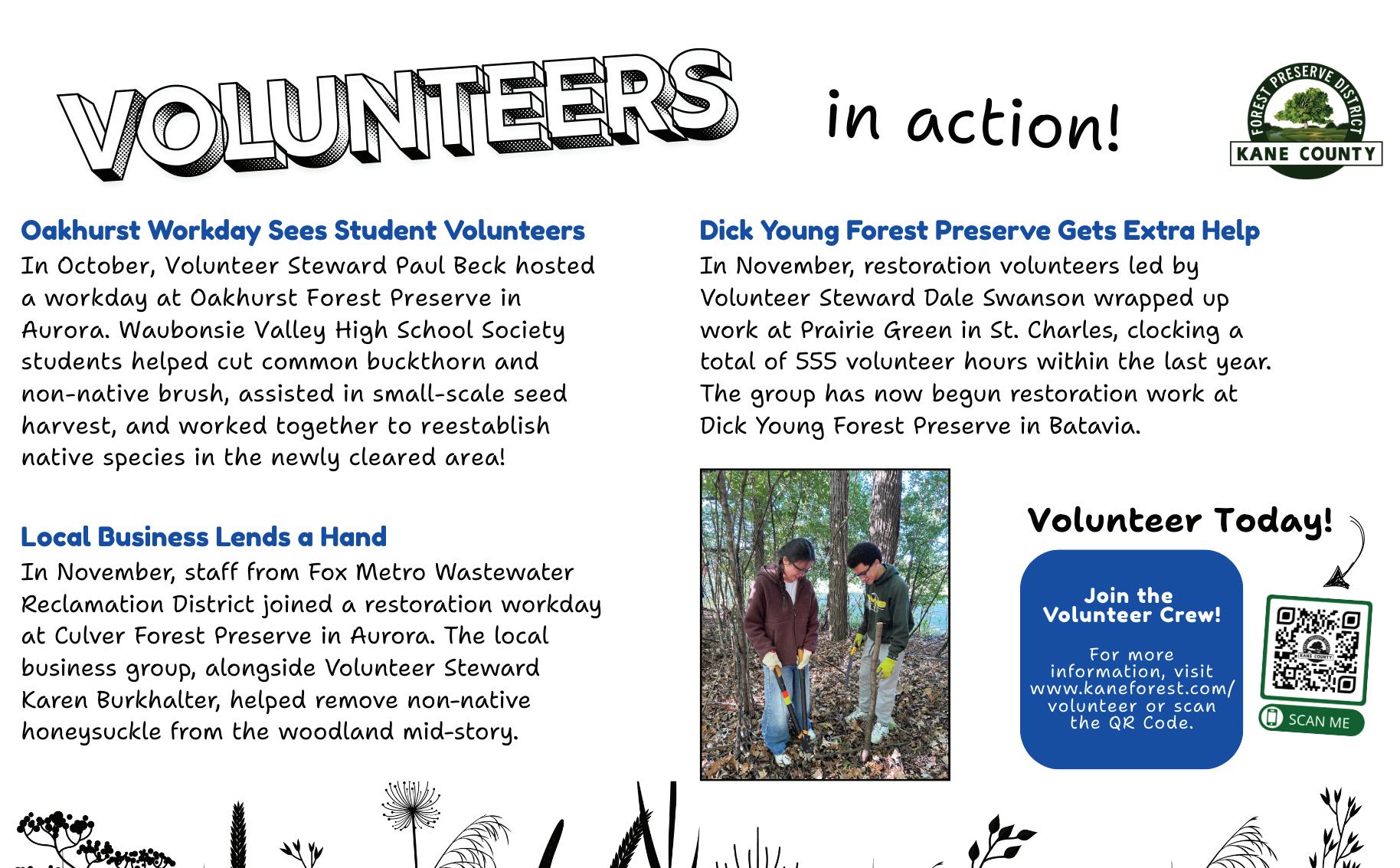 If you would like to be on a permanent quarterly mailing list for this publication, visit http://bit.ly/ForestPreserve_Email, Email us at forestpreserve@kaneforest.com or call 630-232-5980