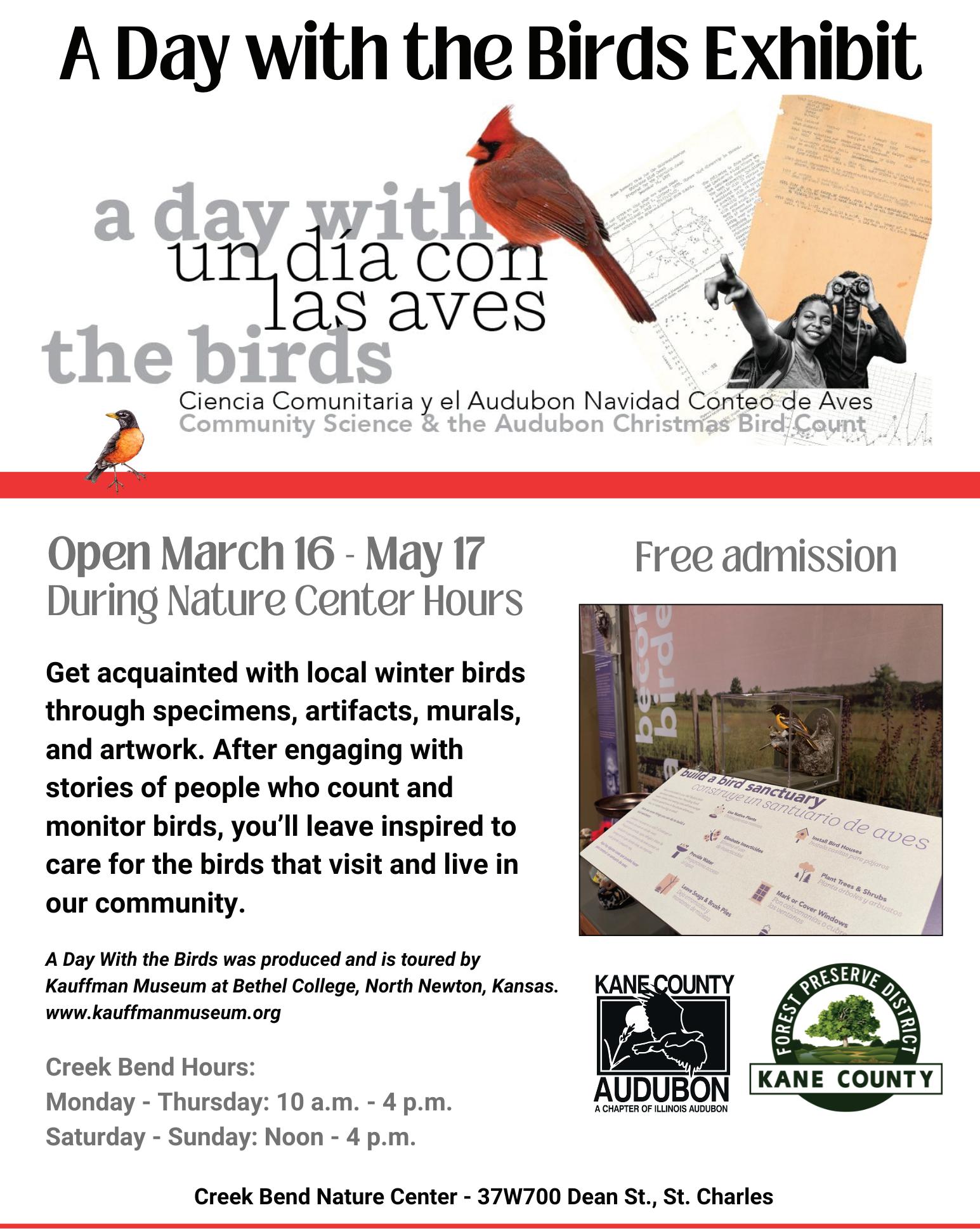 Christmas Bird Count at the new A Day with the Birds traveling exhibit at Creek Bend Nature Center, open March 16 - May 17. You’ll not only learn about the bird count, but will get acquainted with some of our local winter birds through bird specimens, artifacts, murals and artwork. If fairweather community science is more your speed, join us for an indoor talk: Promise or Peril? The Annual Spring Bird Count and the Health of Illinois’ Birds. You’ll learn about the history of the Spring Bird Count, what we’ve learned from the data, and how you can help.