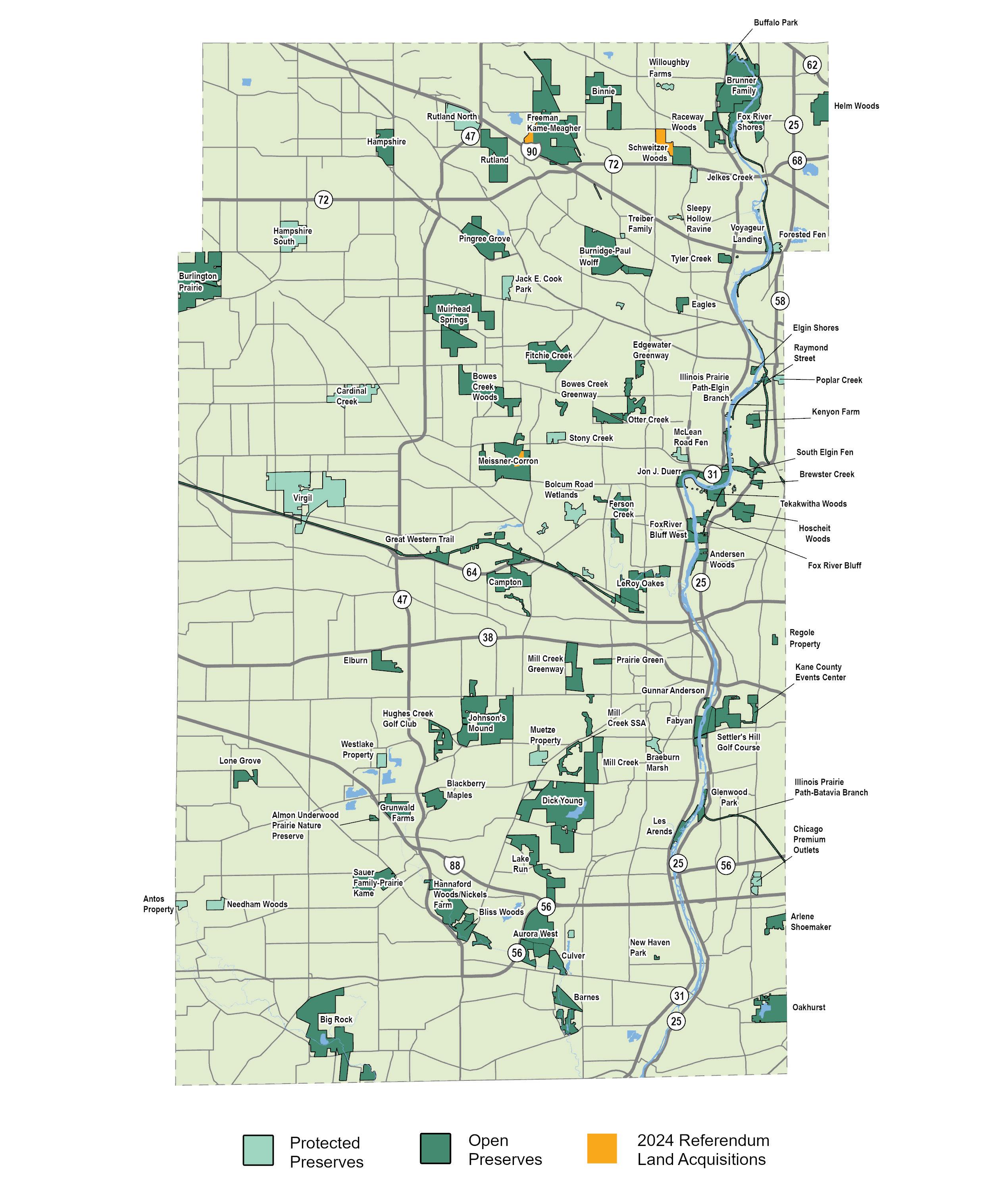 The mission of the Forest Preserve District of Kane County is to acquire, hold and maintain lands within Kane County that contribute to the conservation of natural and historic resources, habitats, flora and fauna; and to restore, restock, protect and preserve such lands for the environmental education, recreation, pleasure and wellbeing of all Kane County citizens.