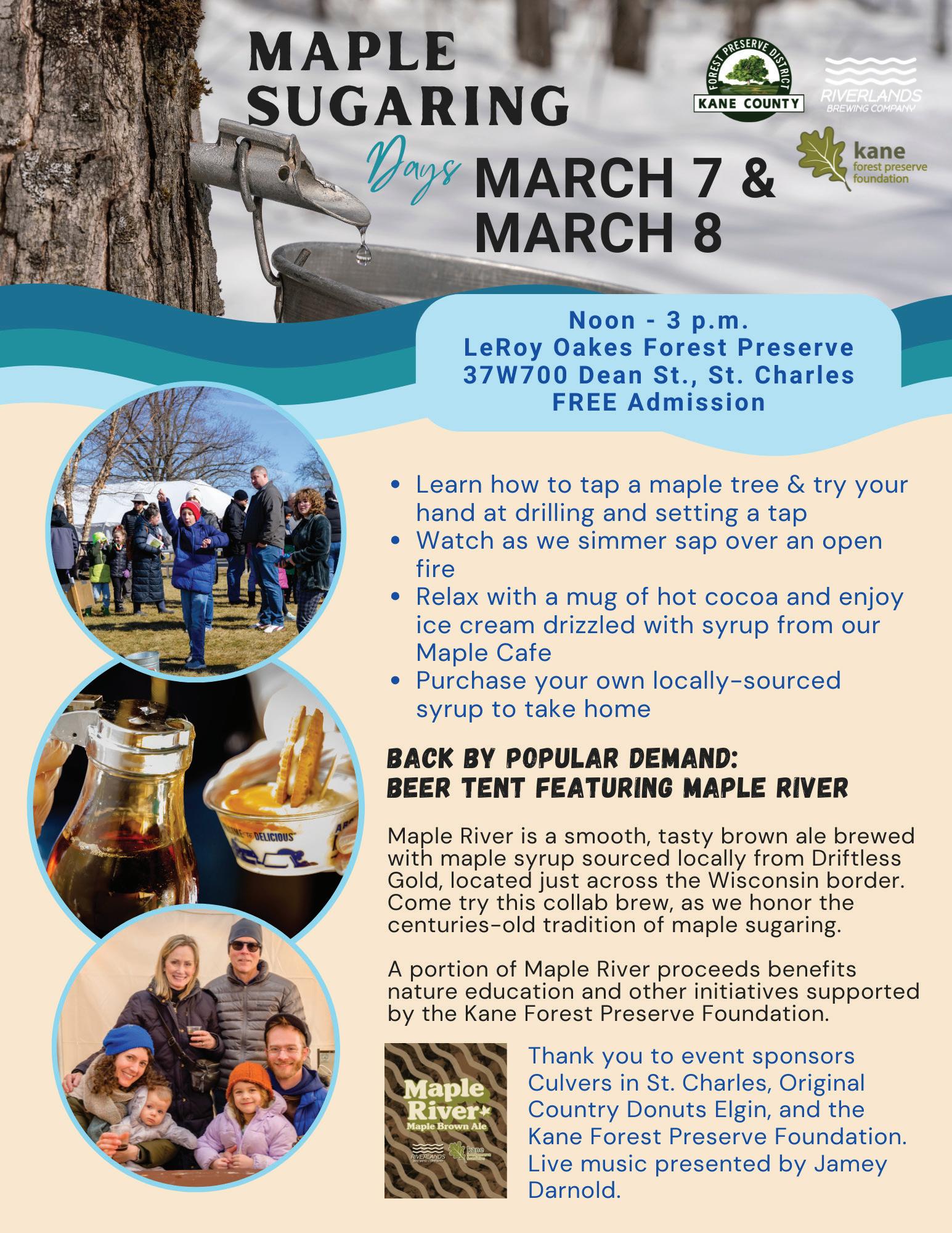 It’s maple sugaring time! Come to Creek Bend Nature Center to explore the art, science, and folklore of the “sugar bush.” Learn how to identify and tap a maple tree and try your hand at drilling and setting a tap. We’ll simmer sap over an open fire and watch as it thickens to syrup. Relax with a mug of hot cocoa and enjoy ice cream with a drizzle of syrup in the Maple Café. After a day of fun, purchase some locally-sourced maple syrup to take home with you. Back by popular demand: Relax under the heated beer tent and enjoy our exclusive “Maple River” brown ale, custom-crafted with real maple syrup by our friends at Riverlands Brewing Company. No registration required.