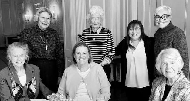 4. From left to right: Susanna McPherson Lane '48, Sr. Bunny Flick, Audrey Threkeld, Sr. O'Dea, Cristina Mendoza '82, Mary Magnano Smith '61, and Clair Rogers Jenkins '46