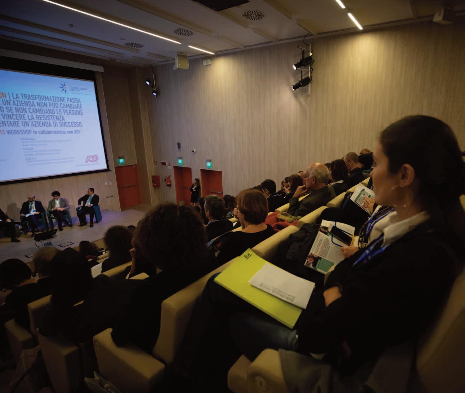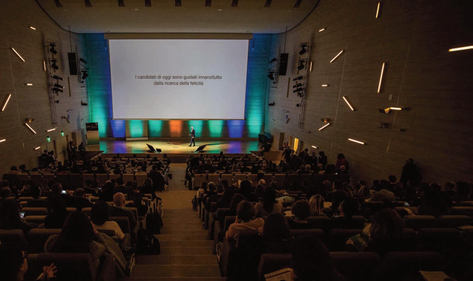 The main hall of the Forum, with 600 seats. Technical features include a 12 x 6.75 m 4K screen, two fixed booths for simultaneous translation, and motorized lighting for customized scenic effects. All sessions are recorded and published on www.comunicazioneitaliana.TV.