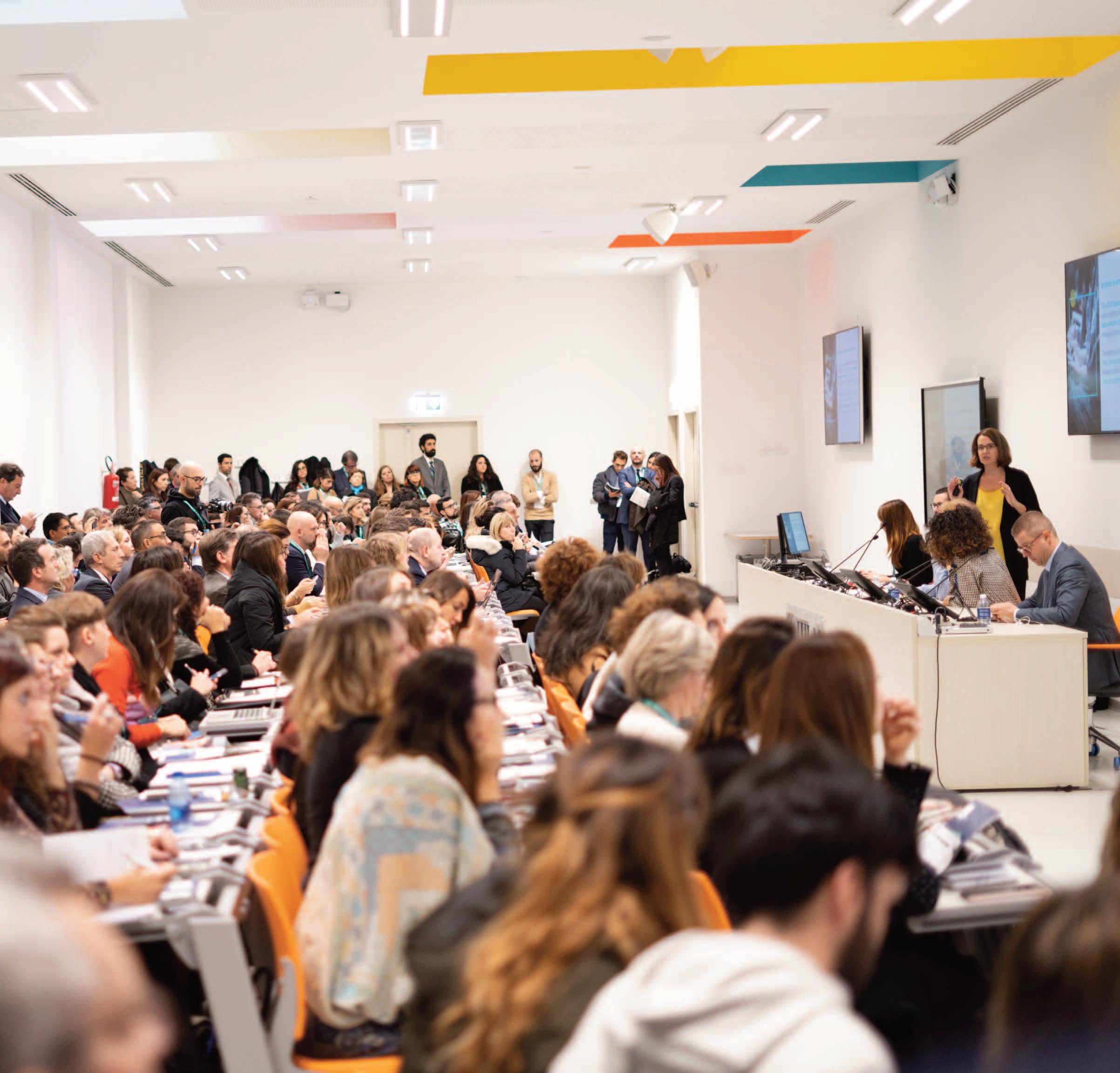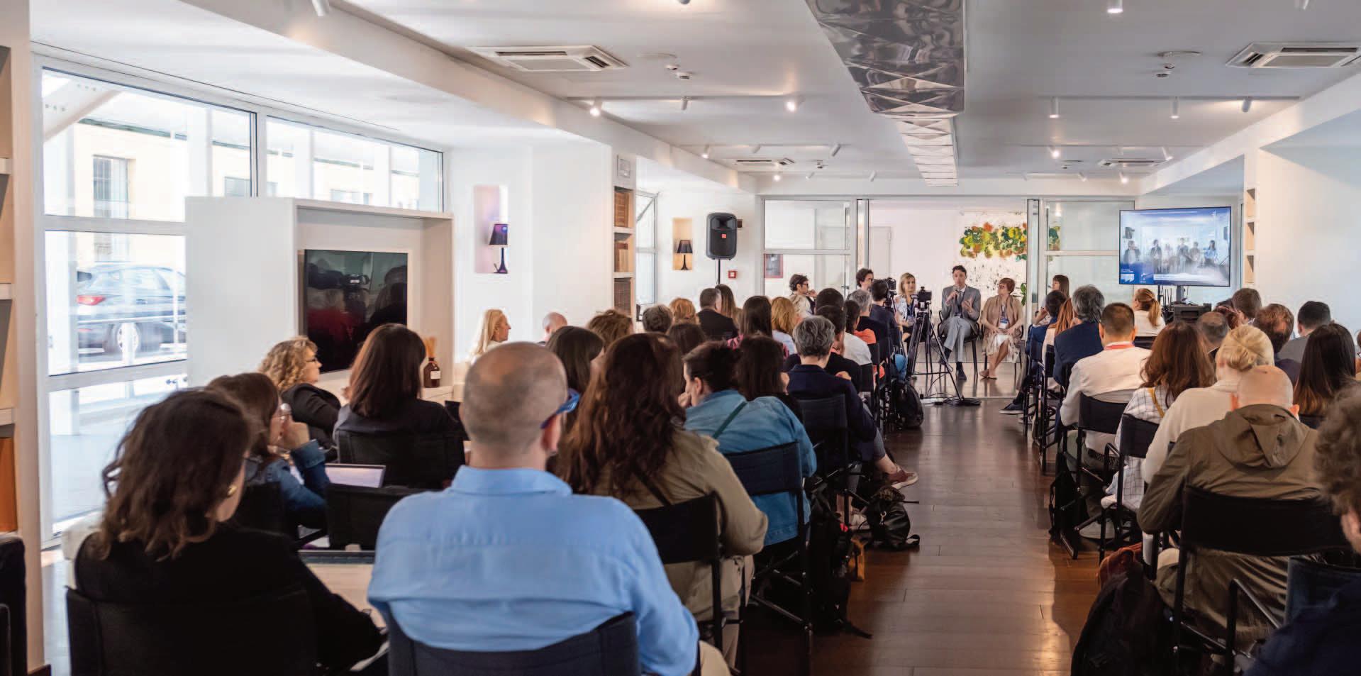 PHYGITAL ROOM | 146 Seats. Features a 5.6 x 3.5 m motorized screen and optional mobile booths for simultaneous translation. Sessions include both an in-person audience and live streaming to a digital audience via www.comunicazioneitaliana.TV.