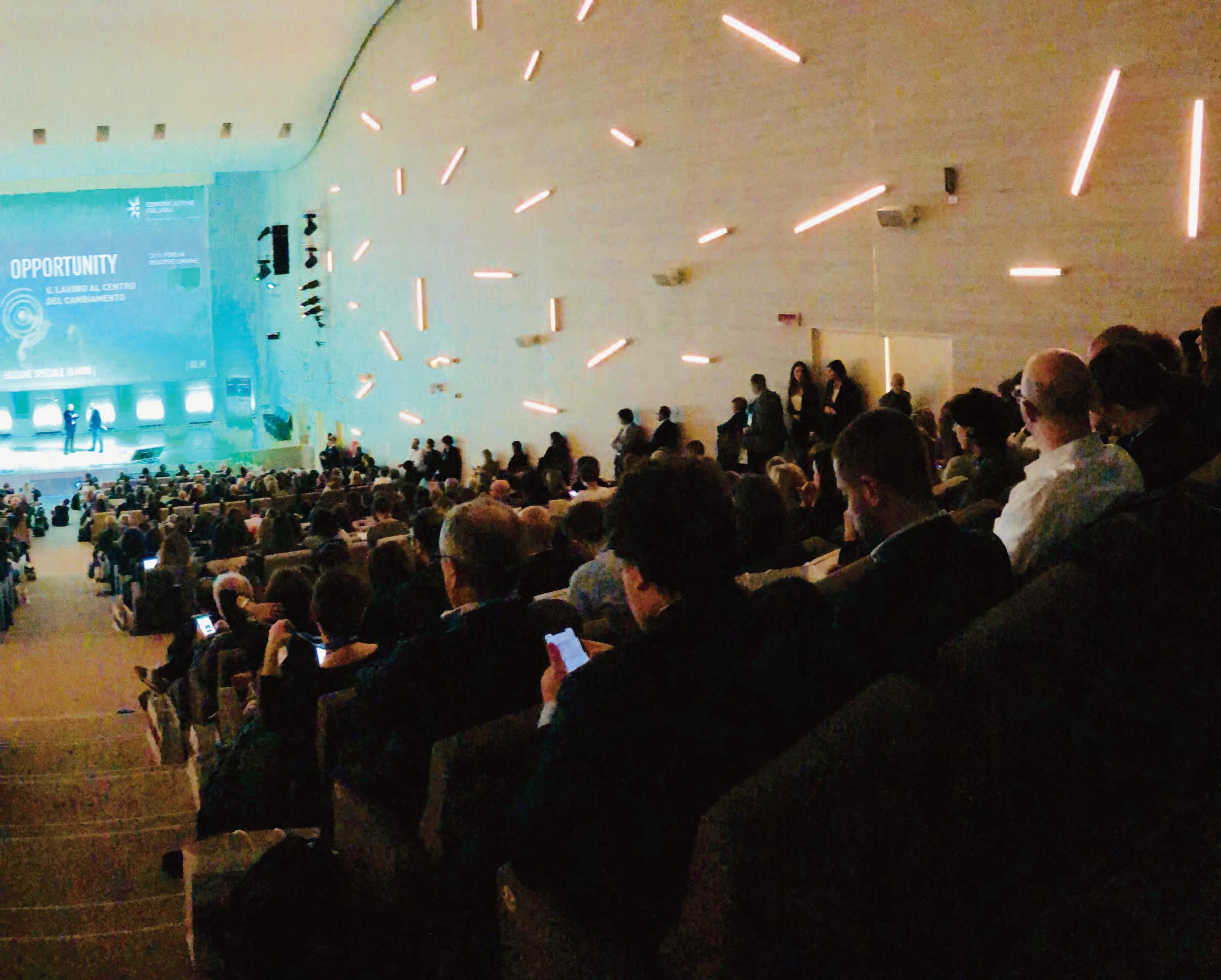 The main hall of the Forum, with 600 seats. Technical features include a 12 x 6.75 m 4K screen, two fixed booths for simultaneous translation, and motorized lighting for customized scenic effects. All sessions are recorded and published on www.comunicazioneitaliana.TV.