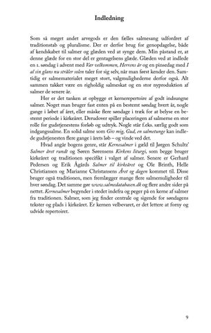 Indledning Som så meget andet arvegods er den fælles salmesang udfordret af traditionstab og pluralisme. Der er derfor brug for genopdagelse, både af kendskabet til salmer og glæden ved at synge dem. Min påstand er, at denne glæde for en stor del er gentagelsens glæde. Glæden ved at indlede en 1. søndag i advent med Vær velkommen, Herrens år og en pinsedag med I al sin glans nu stråler solen taler for sig selv, når man først kender den. Samtidig er salmematerialet meget stort, valgmulighederne derfor også. Alt sammen takket være en righoldig salmeskat og en stor nyproduktion af salmer de senere år. Her er det tanken at opbygge et kernerepertoire af godt indsungne salmer. Noget man bruger fast enten på en bestemt søndag hvert år, nogle gange i løbet af året, eller måske flere søndage i træk for at belyse en bestemt periode i kirkeåret. Derudover spiller placeringen af salmerne en stor rolle for gudstjenestens forløb og udtryk. Nogle står f.eks. særlig godt som indgangssalme. En solid salme som Giv mig, Gud, en salmetunge kan indlede gudstjenesten flere gange i årets løb – og vinde ved det. Hvad angår bogens genre, står Kernesalmer i gæld til Jørgen S chultz’ Salmer året rundt og Søren Sørensens Kirkens liturgi, som begge b ruger kirkeåret og traditionen specifikt i valget af salmer. Senere er G erhard Pedersen og Erik Ågårds Salmer til kirkeåret og Ole Brinth, Helle Christiansen og Marianne Christansens Året og dagen kommet til. Disse bruger også traditionen, men fremlægger mange flere salmemuligheder til hver søndag. Det samme gør www.salmedatabasen.dk og flere andre sider på nettet. Kernesalmer begynder i stedet indefra og peger på en kerne af salmer fra traditionen. Salmer, som jeg finder centrale og sigende for søndagens tekster og plads i kirkeåret. Er kernen velbevaret, er det lettere at forny og udvide repertoiret.