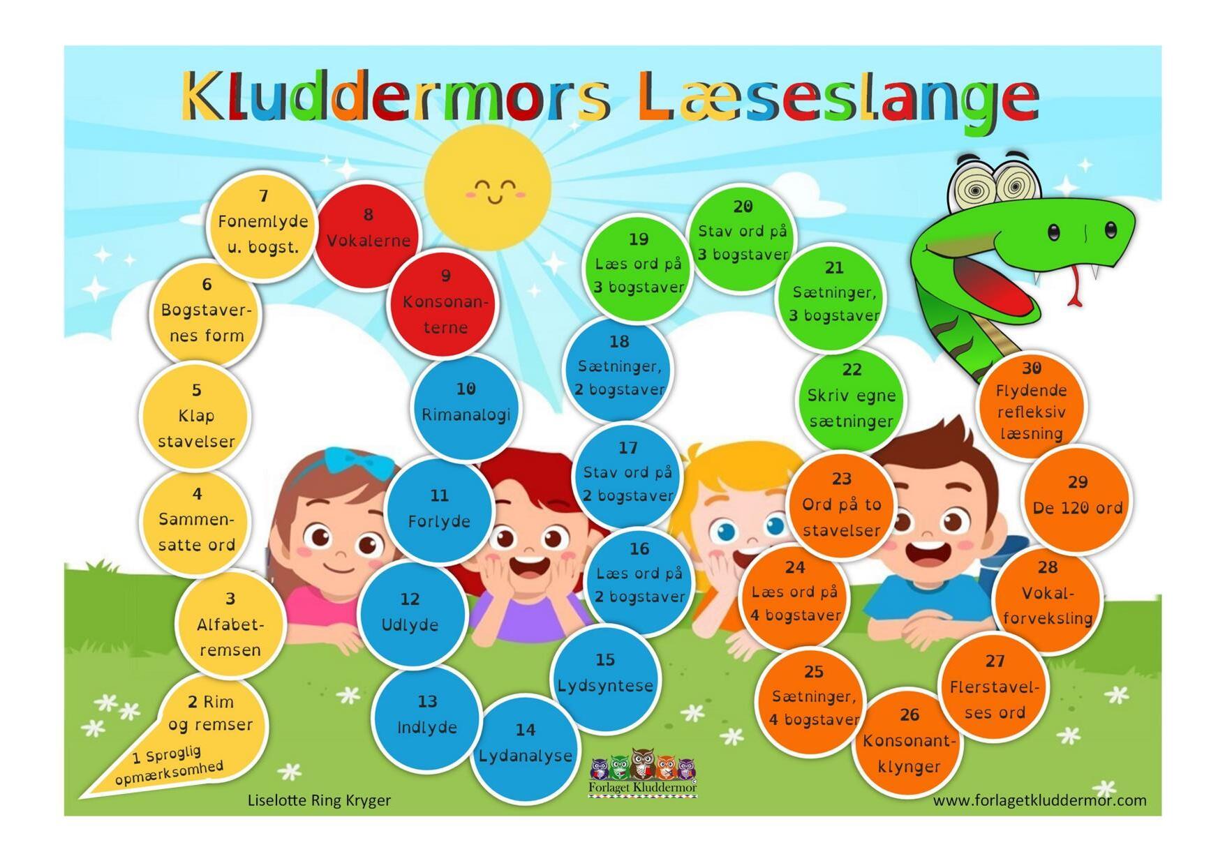 ”Læseslangen” er en oversigt over hele Forlaget Kluddermors Læseprogram, som består af over 400 materialer fordelt på 30 læseudviklende trin. Hvert trin bygger videre på den viden barnet allerede har tilegnet sig fra tidligere trin. Ved på denne