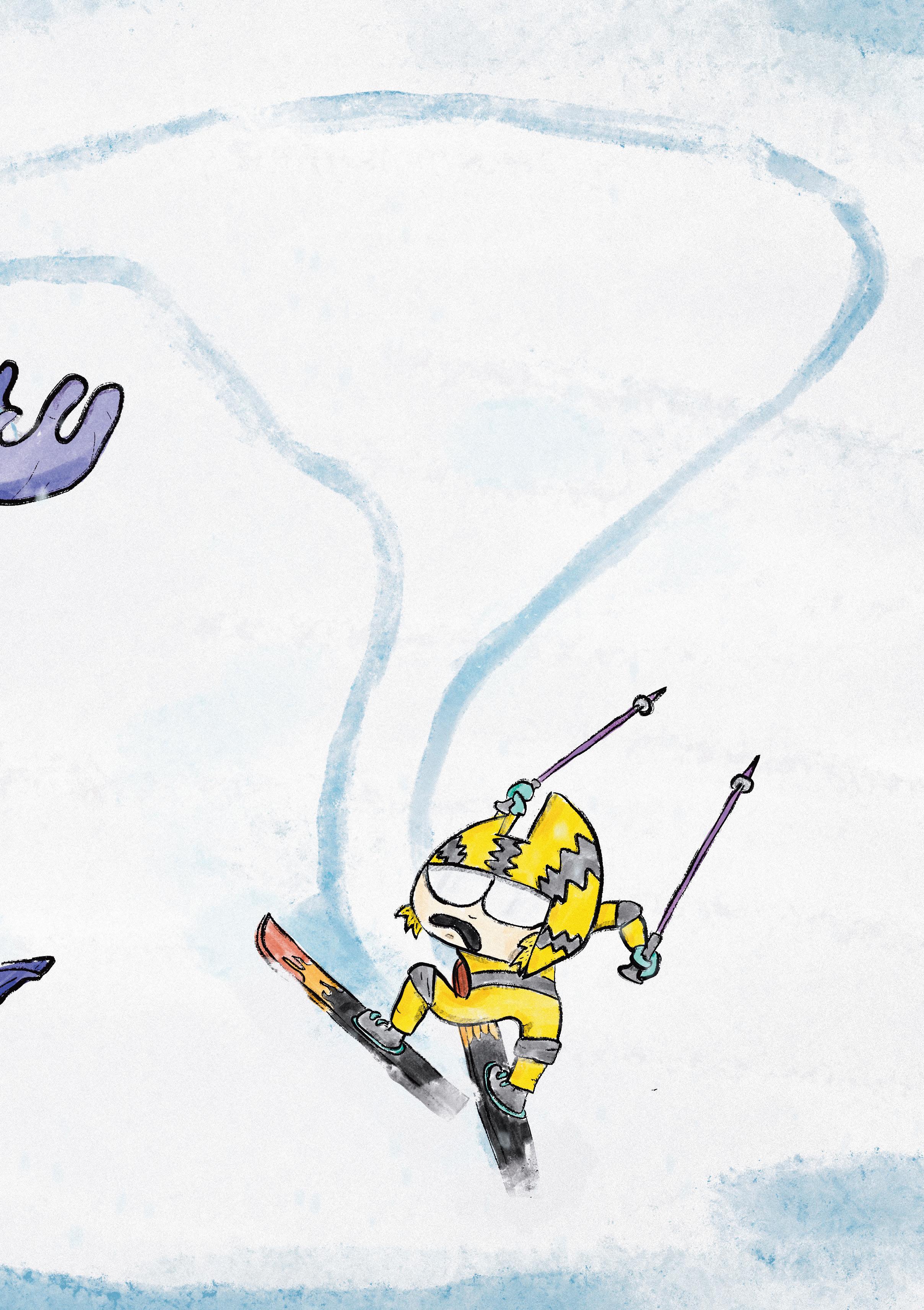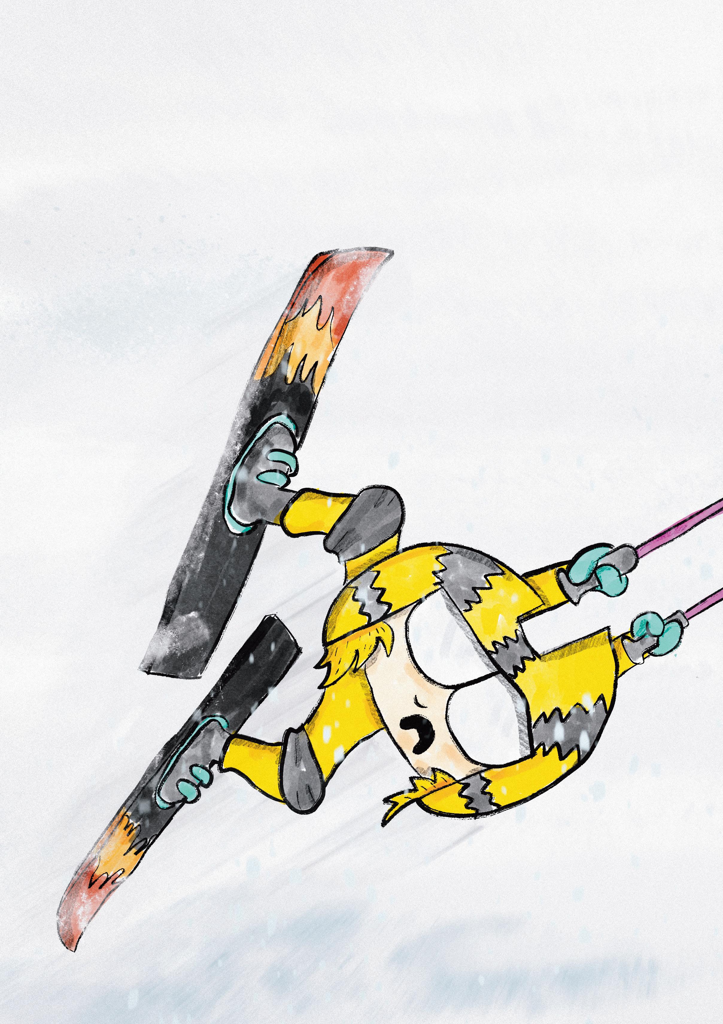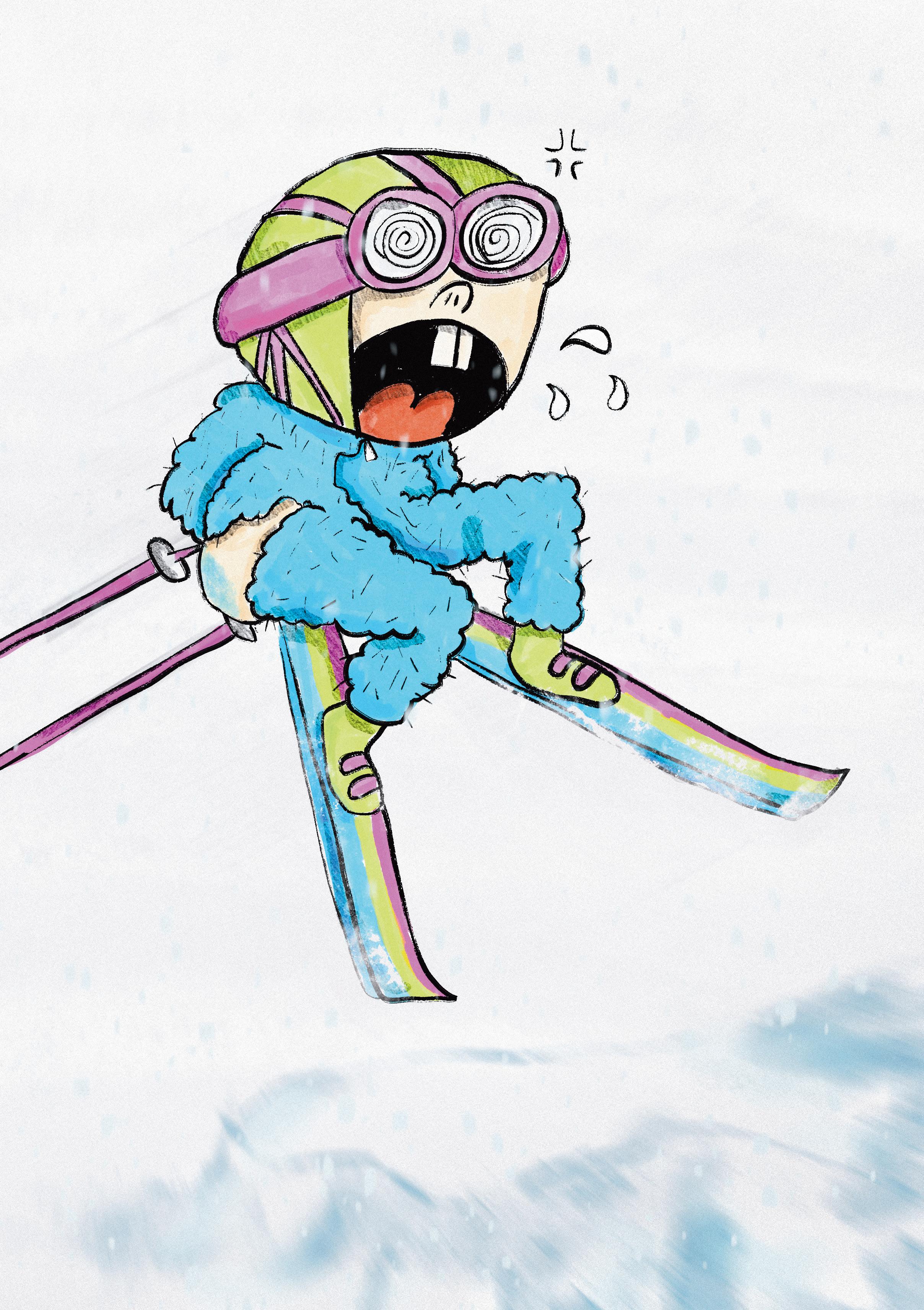 Lui kan stå på ski.Det er han god til.Det går ned og ned.Se al den sne.Hov, pas nu på! Se dig for.Der er en blå mås.