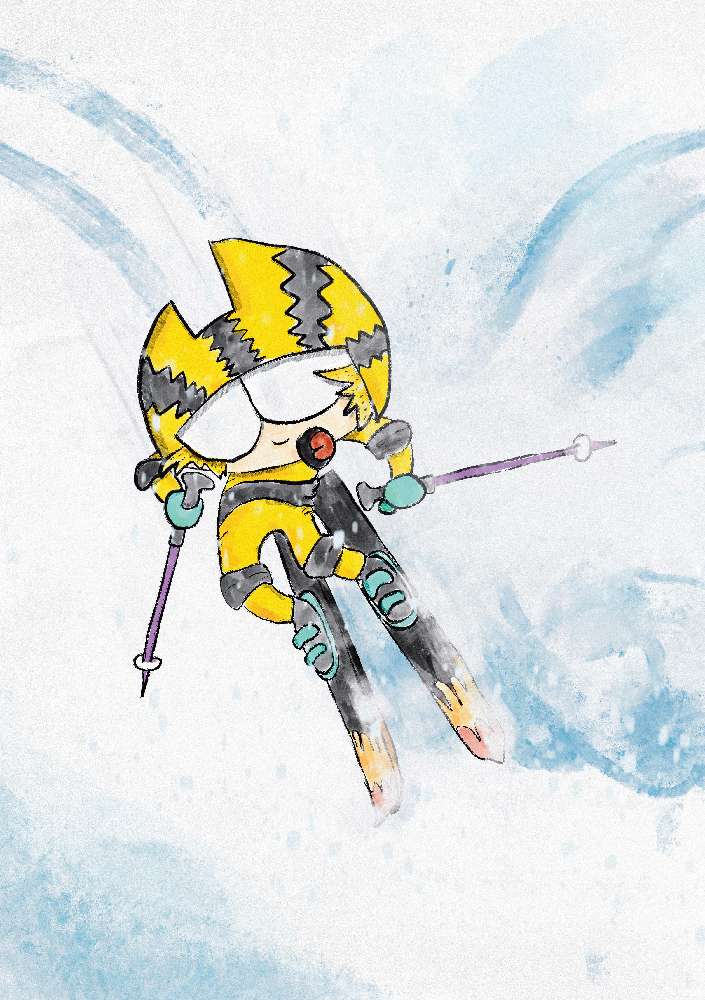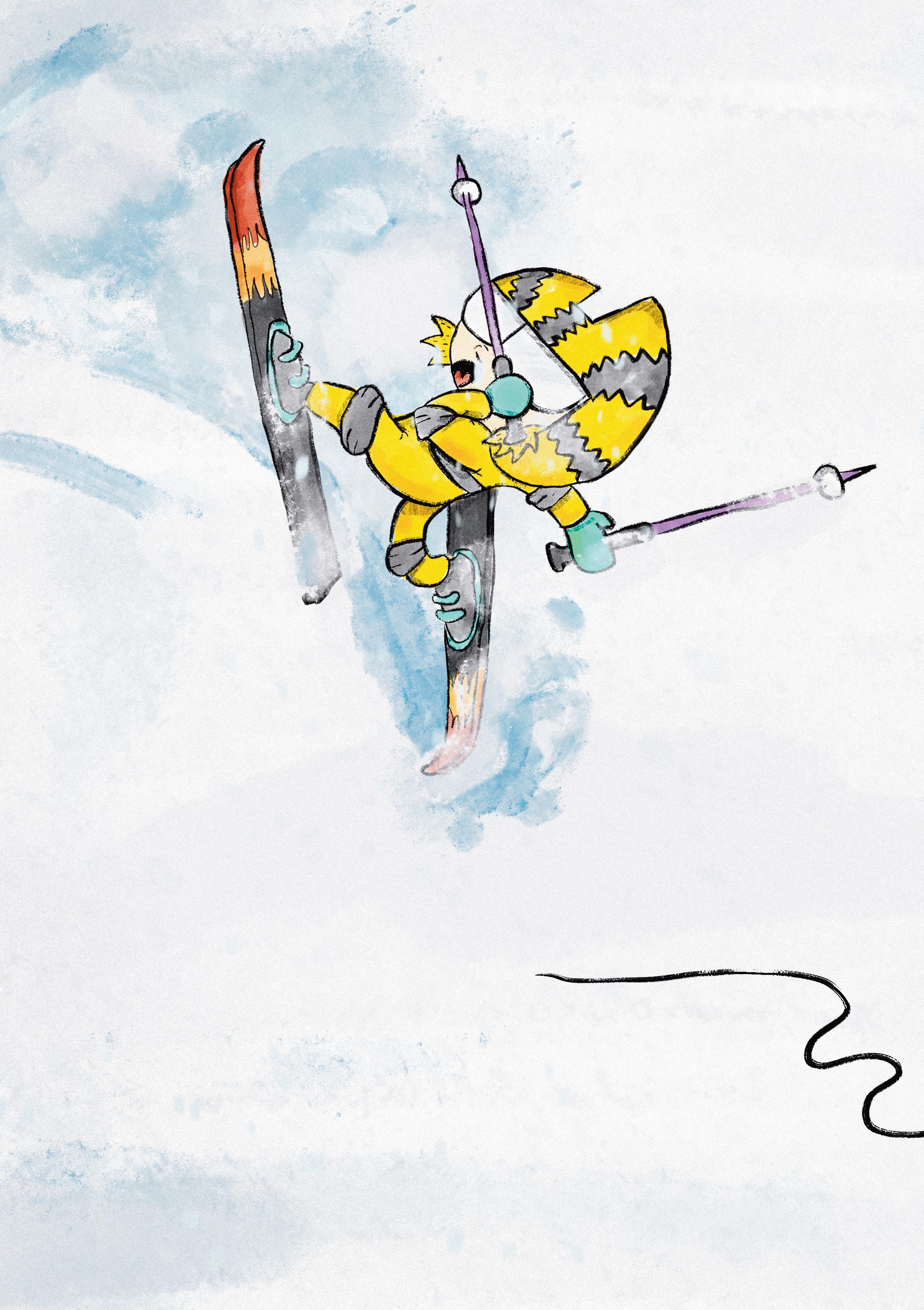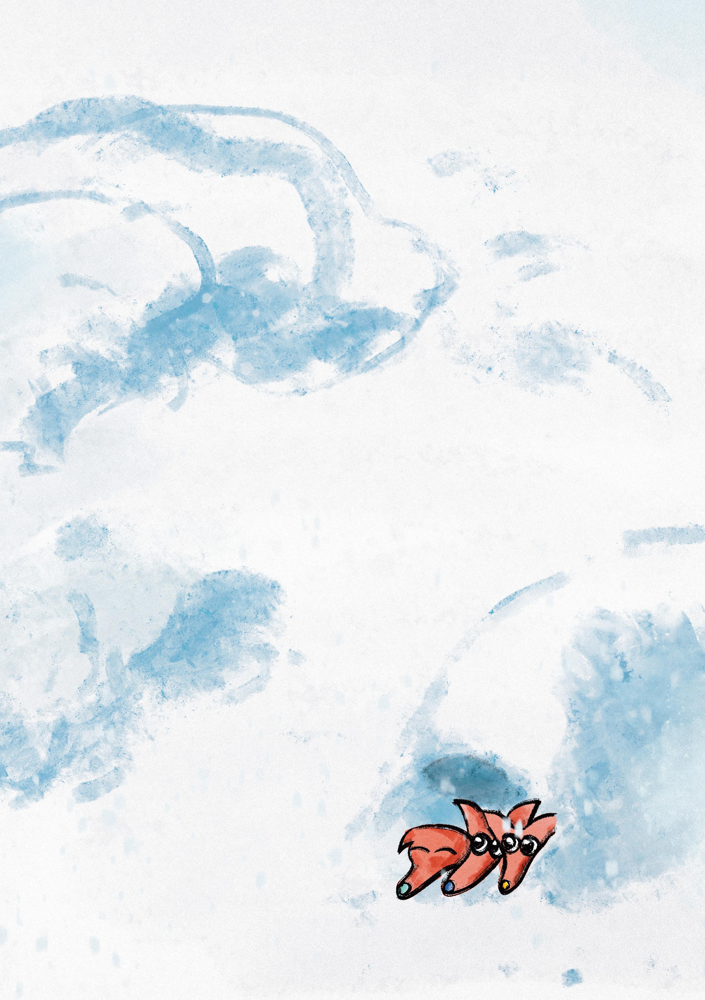 Lui kan stå på ski.Det er han god til.Det går ned og ned.Se al den sne.Hov, pas nu på! Se dig for.Der er en blå mås.