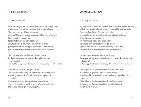 Jeg havde efterladt mit pas i en kro hvor vi havde været en nat eller så og hvis navn jeg ikke kunne huske. Det var sådan det begyndte. Det næste hotel ville ikke tage imod mig, et smukt hotel, i en appelsinlund, med udsigt over havet. Hvor skødesløst du tog imod det værelse der skulle have været vores og, senere, hvor muntert du stod på altanen og smed chokolader i sølvpapir efter mig. Næste dag genoptog du den rejse vi skulle have gjort sammen.