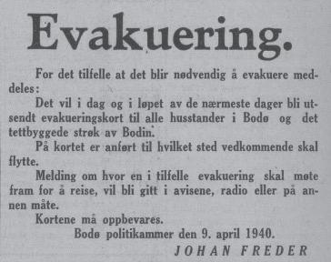 Når mobiliseringen iverksettes, gjøres det samtidig klart for evakuering av Bodøs innbyggere. Det er politimester Freder som rettleder befolkningen vedrørende bruken av evakueringskortene som sendes alle husstander.