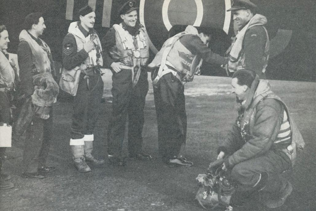 Flykaptein Gunnar Halle (stående til høyre) og hans faste Halifaxmannskap. (Foto: Ukjent).