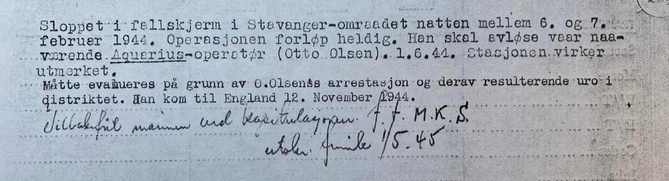 hytte på sin eiendom. Spørsmålet ble drøftet med naboen Jonas Vaule, og selvfølgelig hadde svaret blitt ja fra begge.21 I slutten av november 1943 kjørte Sverre Vinningland radiosenderen AQUARIUS og annet utstyr til Vaule med varevognen han ellers brukte i bakerforretningen sin i Bjerkreim. Otto Olsen (Odd), Ernst Askildsen (Reidar) fra Stavanger, Jon Førre (Thorvald) fra Førre i Jøsenfjorden, Alf Vikeså, Sigurd Vaule og Harald Vinningland var også med på denne svært farlige ekspedisjonen.22 Etter dette ble to av de tre vaulegårdene svært viktige og trygge baser og dekningssteder for en rekke radioagenter og andre motstandsfolk. Askildsen og Bakka var Olsens sentrale medhjelpere.