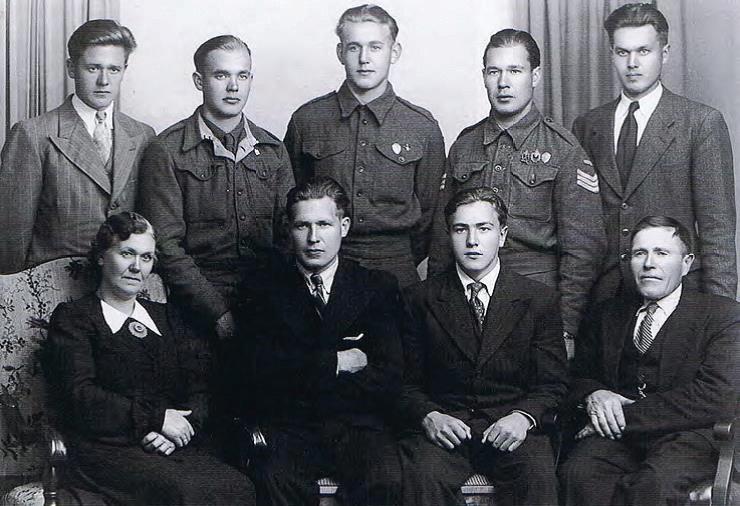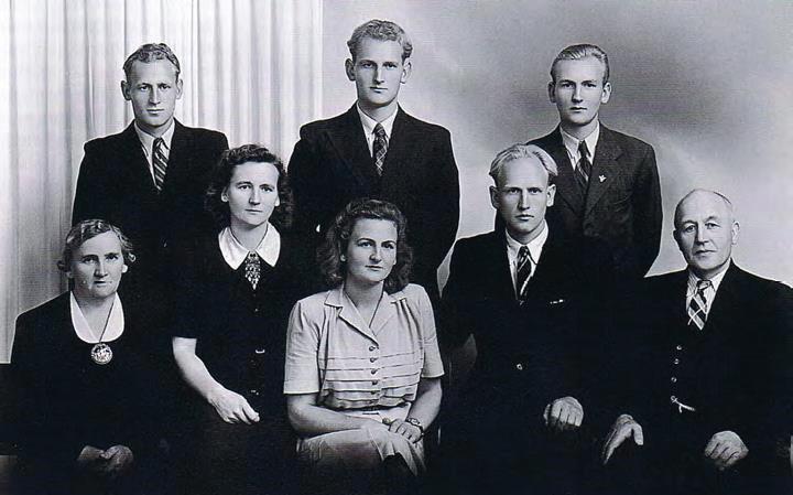 Familien Kristian Vaule (alder i 1944). Foran fra venstre: Gunhild (49), Lloyd (25), Karsten (15) og Kristian (60). Bak fra venstre: Bjørn (20), Leif (21), Sem (17), Ludvig (26) og Olaf (23). (Fotoeier: Jorunn Kydland).
