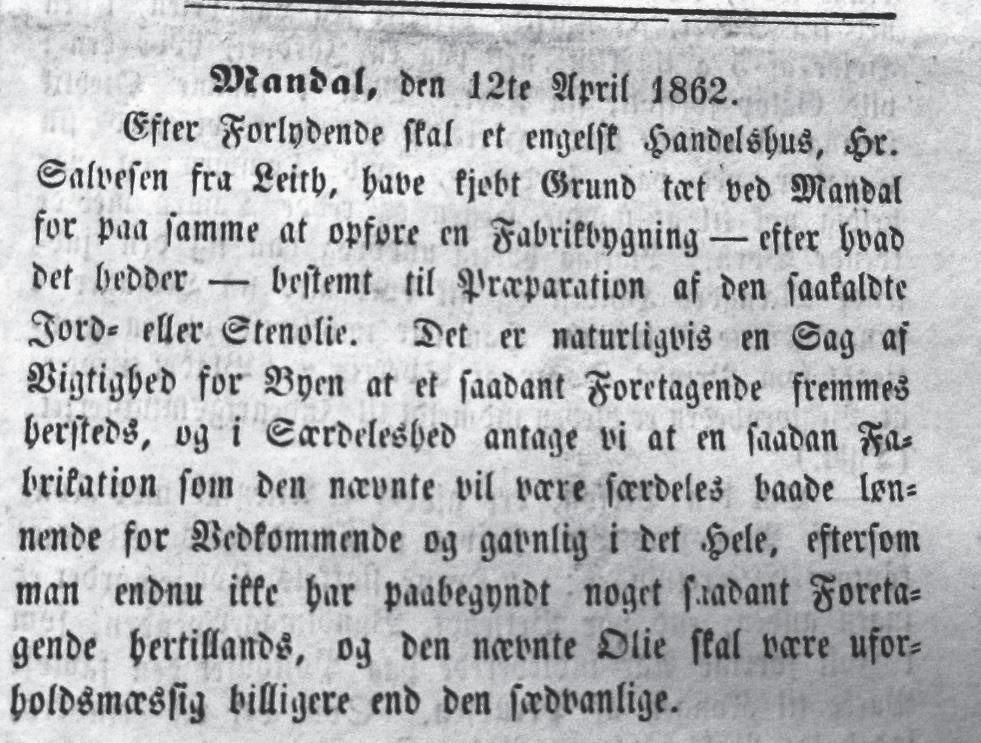 Men det var likevel ikke grossererne som bidro mest til å introdusere lampeolje i Norge. Det skulle bli et usedvanlig og overraskende industriforetak i Mandal på agderkysten.